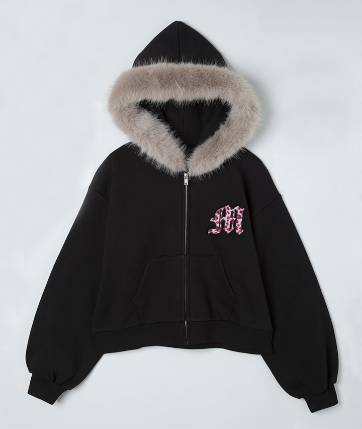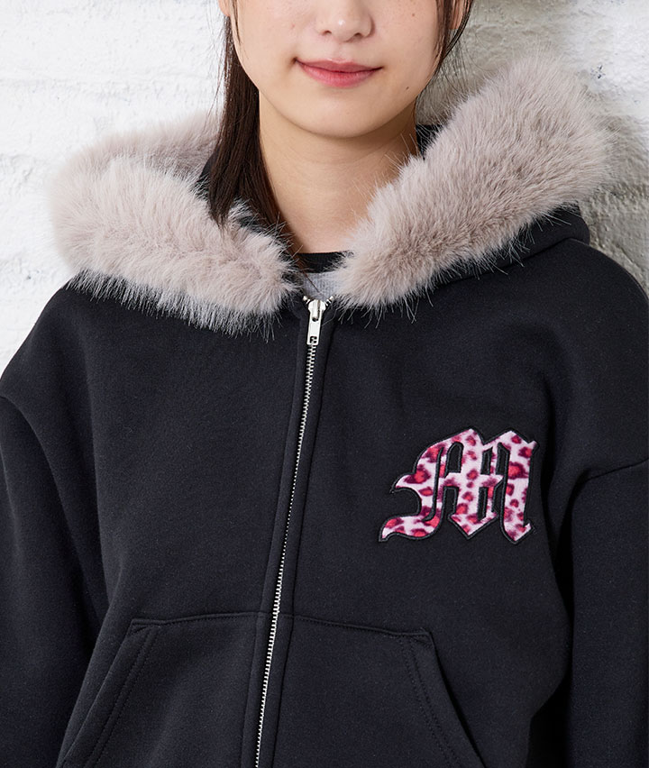 ヒョウ柄貼付フードファーパーカ