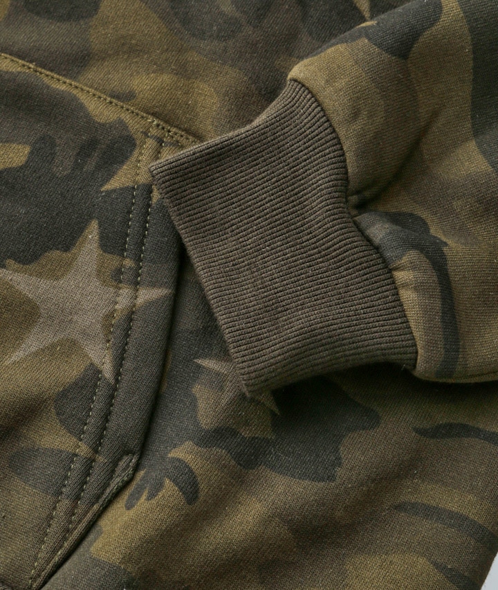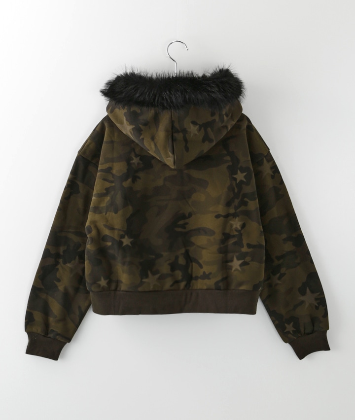 ・星迷彩カラーでフードにファーが付いているパーカーです。