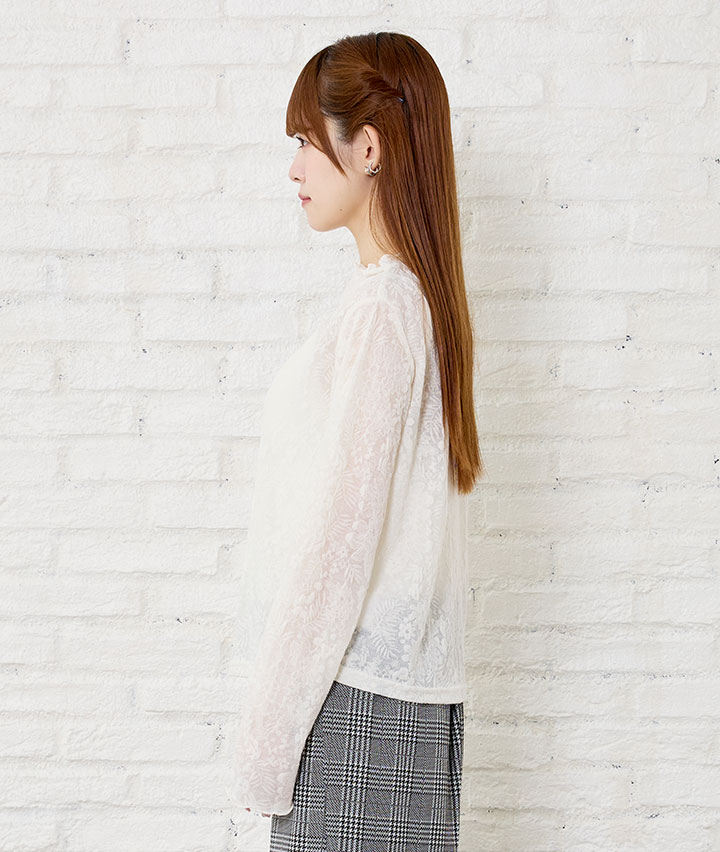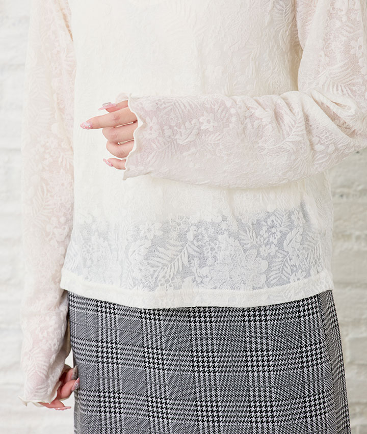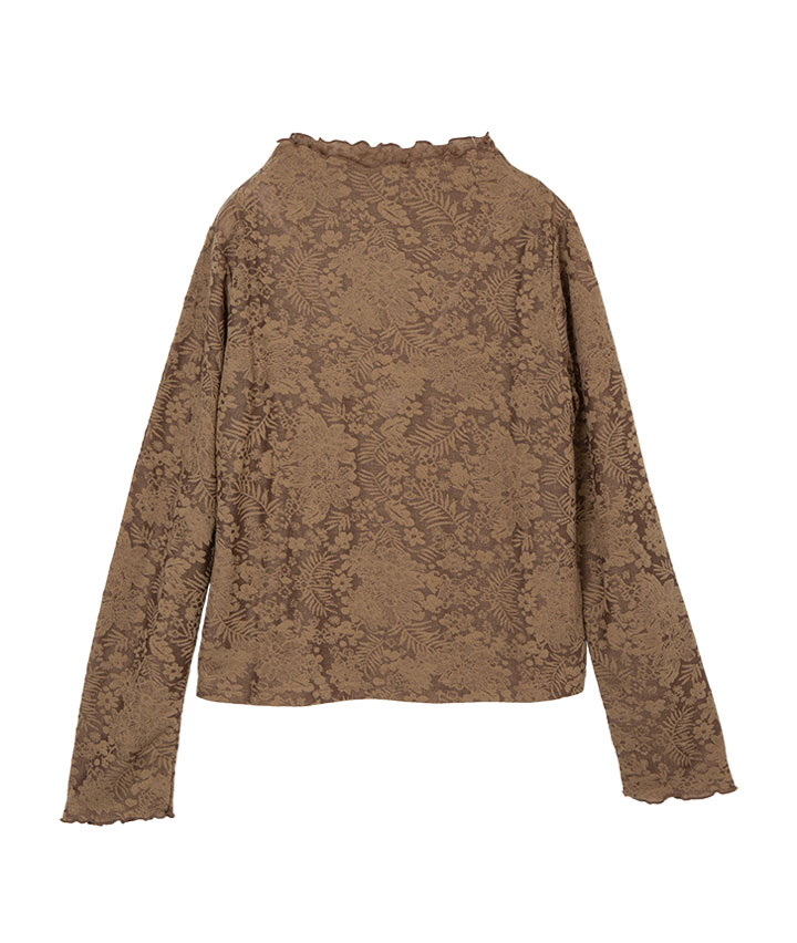 ・華やかな総柄が目を惹く1枚。ボディはベーシックな形で作っているので、かわいらしくなり過ぎず大人カジュアルに着られます。