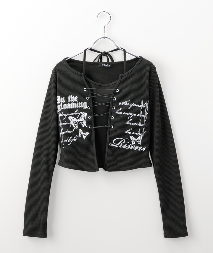 ・蝶のラメプリントがかわいいプルオーバー。トレンドのあみあげ×レイヤード仕様です。