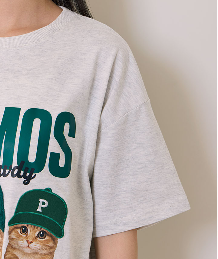・帽子が貼り付けされた立体感のあるデザイン。ネコが3匹プリントされたTシャツ。