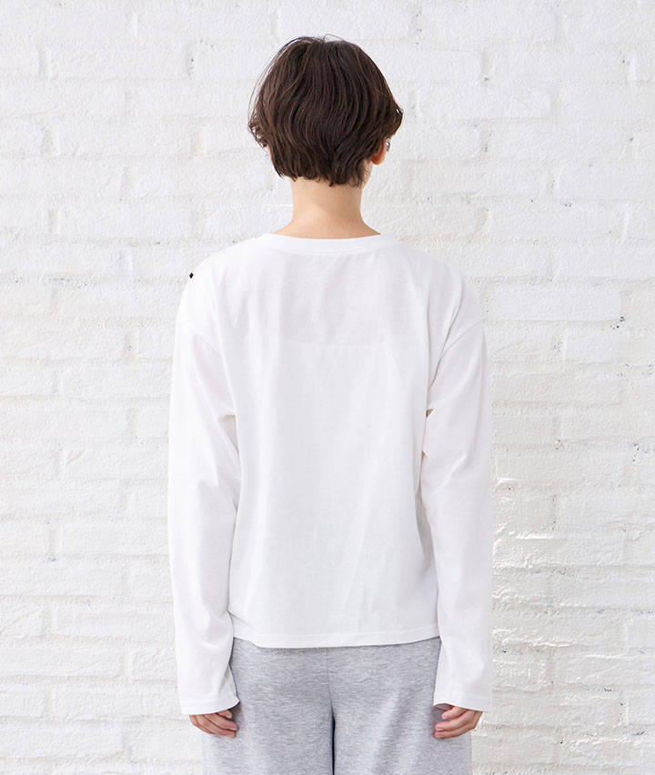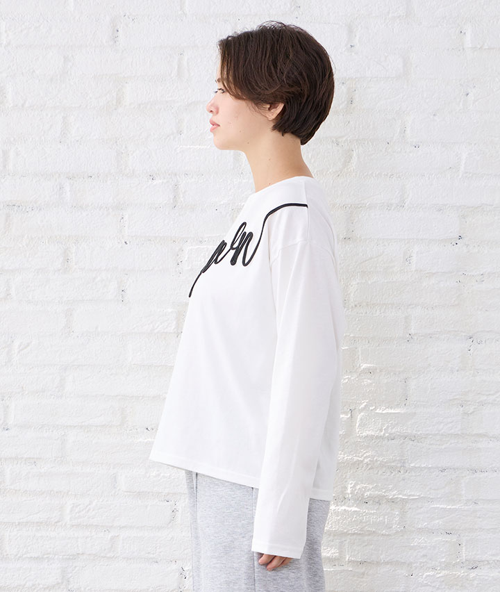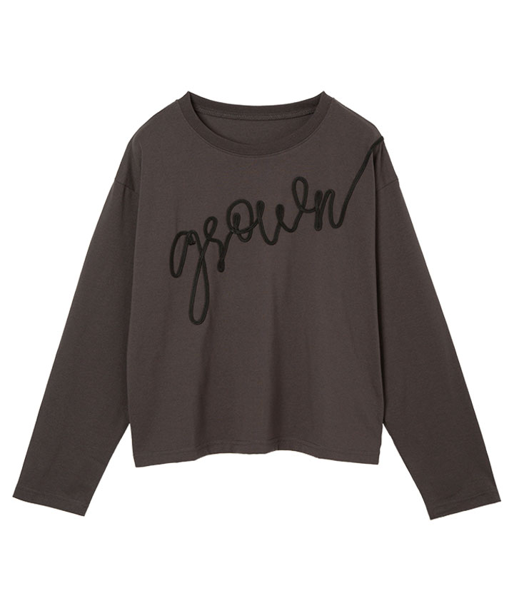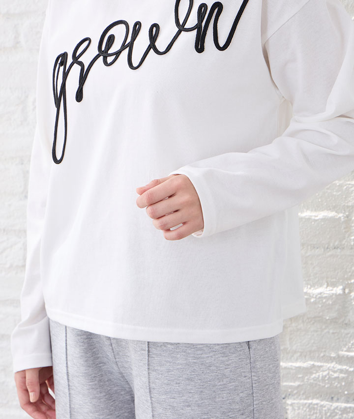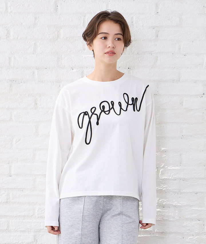 ・ニュアンスたっぷりなコード刺しゅう入りのTシャツ。流れるようなロゴのイメージで、大人かわいい雰囲気です。