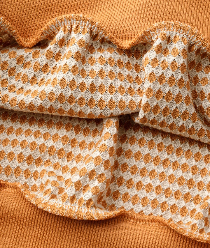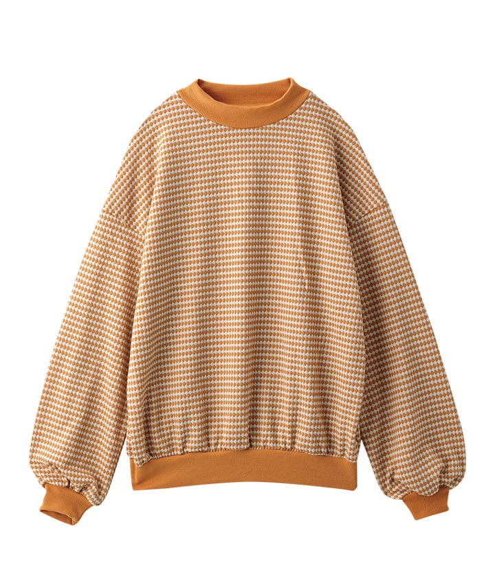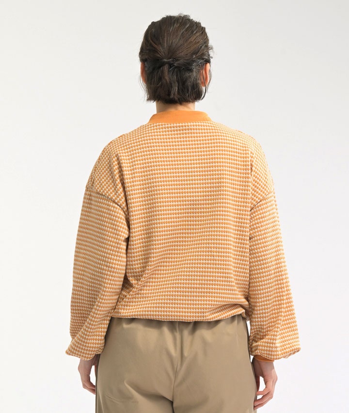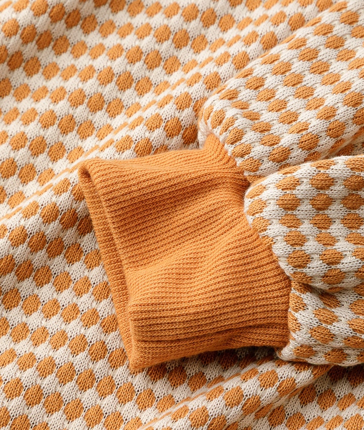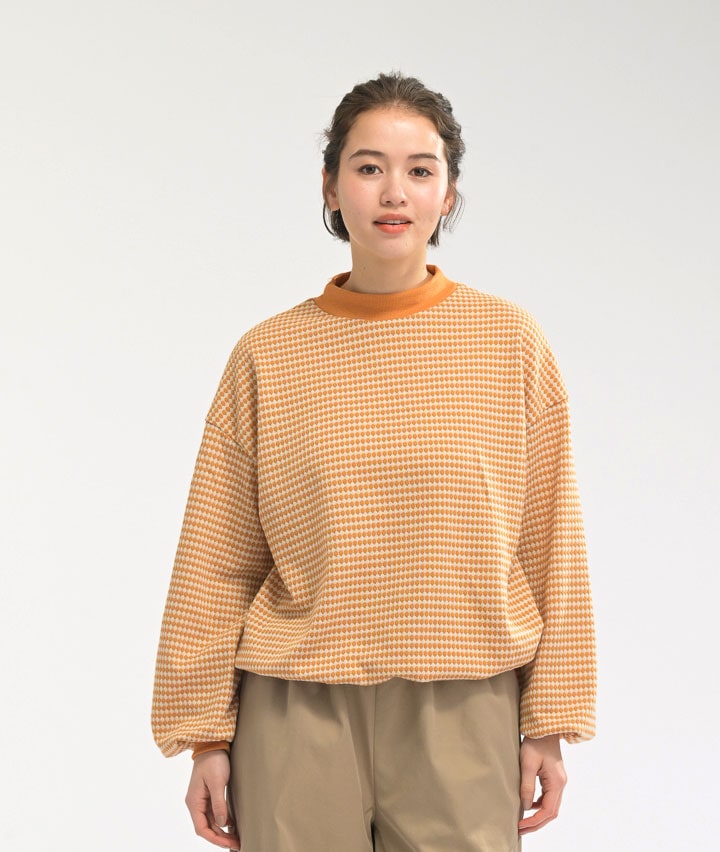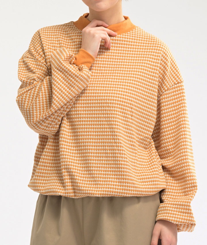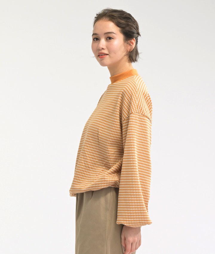 ・レトロな雰囲気のジャガード編みカットソー。配色のリブ切り替えでメリハリのあるデザインです。