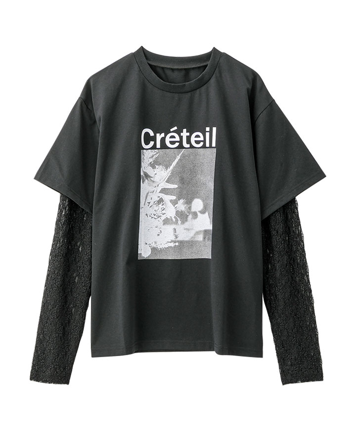・袖からレースをドッキングさせた、レイヤード風デザインのTシャツ。レイヤードスタイルに困らないアイテムです。