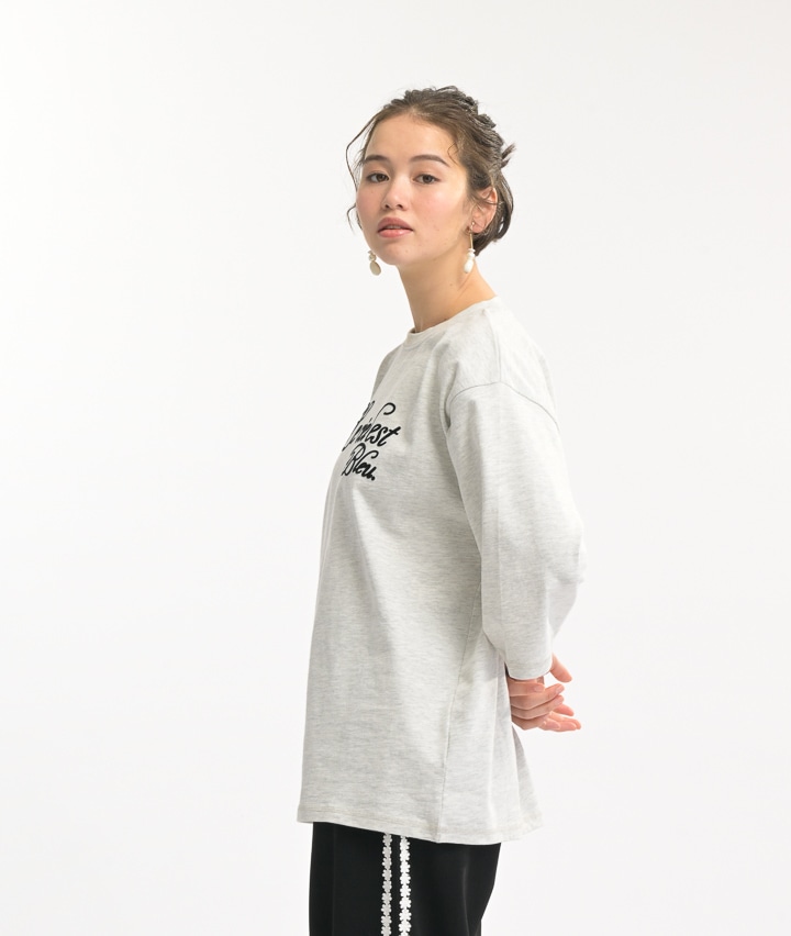 ・表面感のある、フロッキープリントを施したシンプルなロゴTシャツ。一枚着はもちろん、羽織り物のインナーにもおすすめのアイテムです♪
