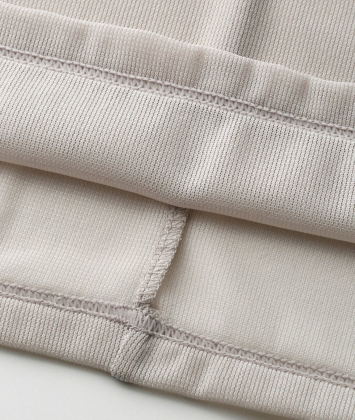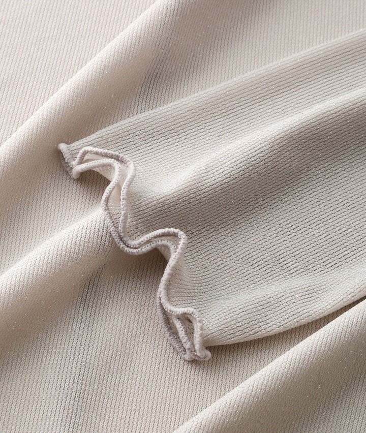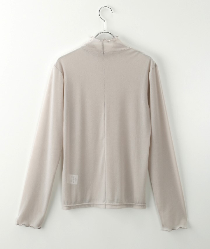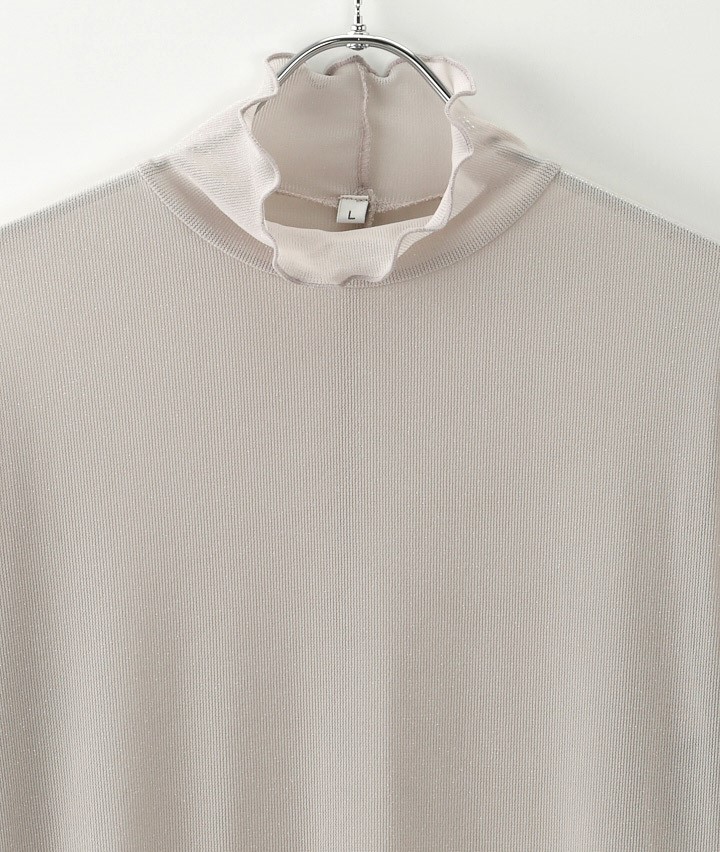 ・ラメニットのハイネックカットソー。\n程よいシアー感があり女性らしいデザインになっています。\n薄手のため秋冬はレイヤードのインナーとしても着用頂けます。