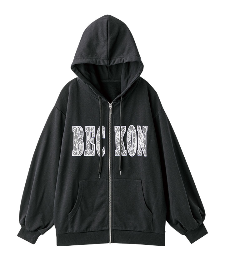 ・フロントのレースを貼り付けたロゴがインパクトのあるジップパーカー。コーディネートの主役になるデザインなので、色違いでコレクションしたいアイテム。
