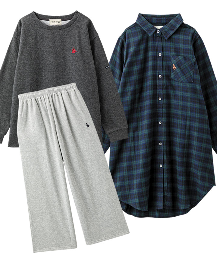 ・シャツ:綿100% トレーナー本体:ポリエステル70%、綿30% トレーナーリブ部分:ポリエステル65%、綿30%、ポリウレタン5% パンツ:ポリエステル70%、綿30%