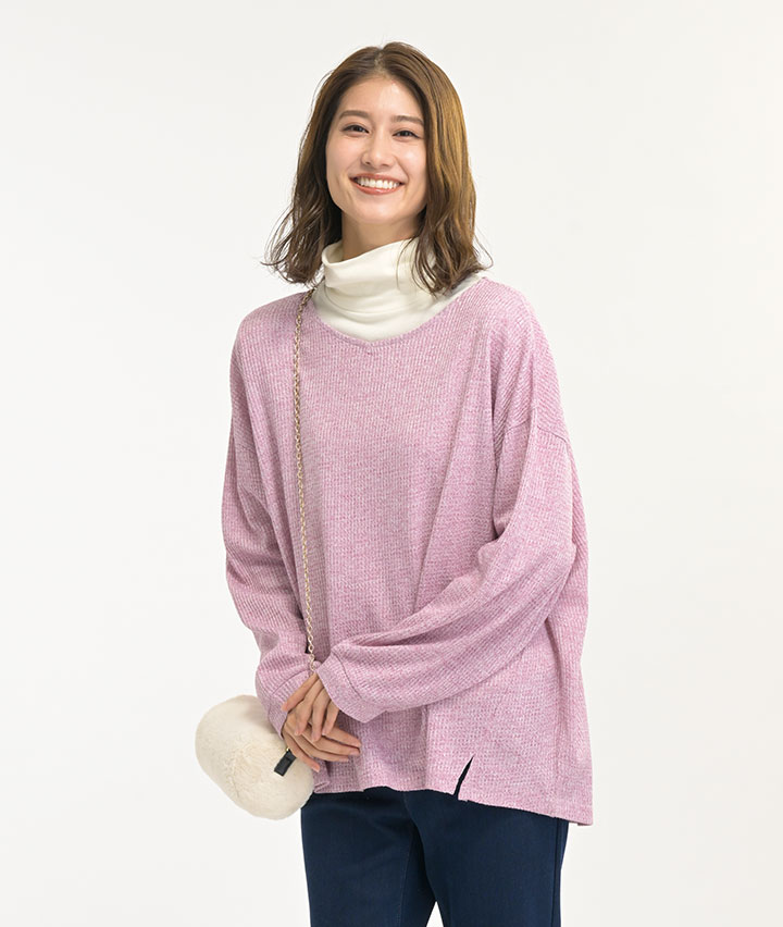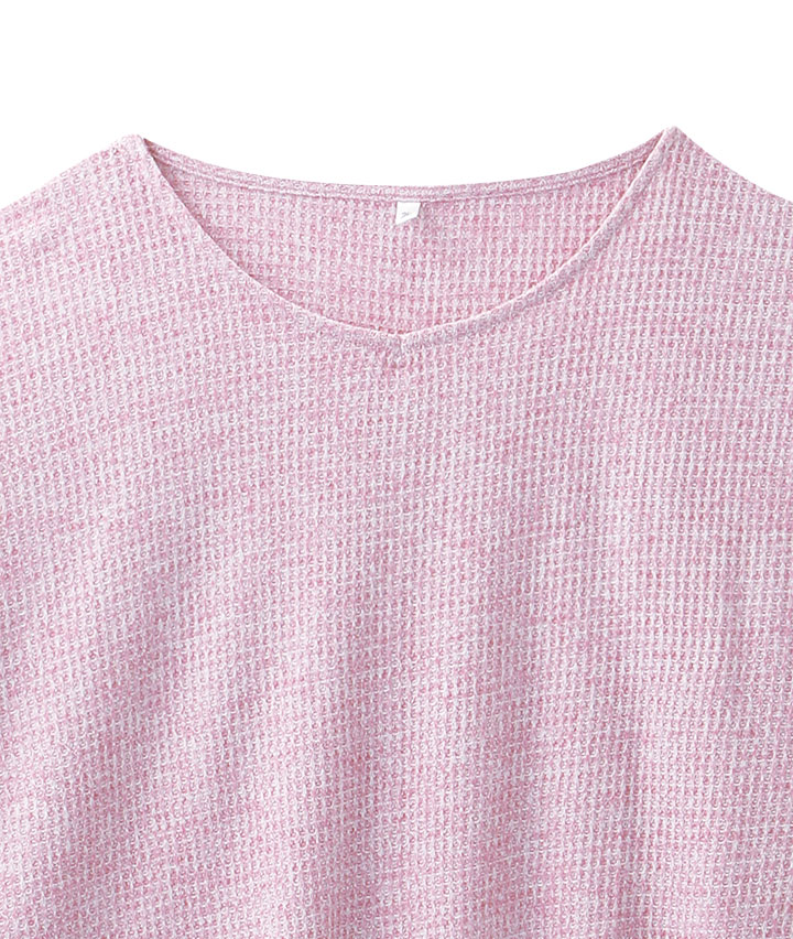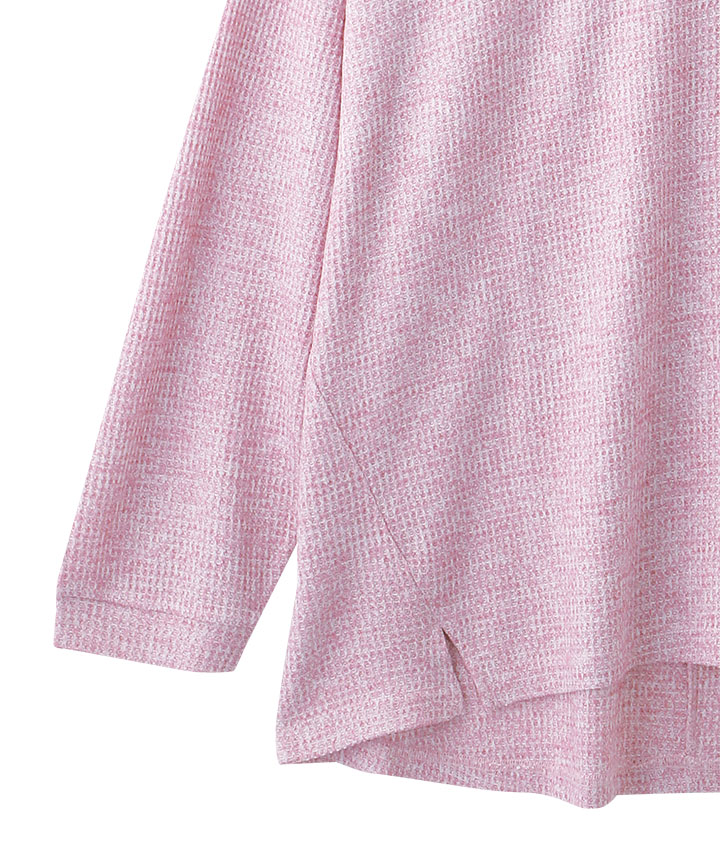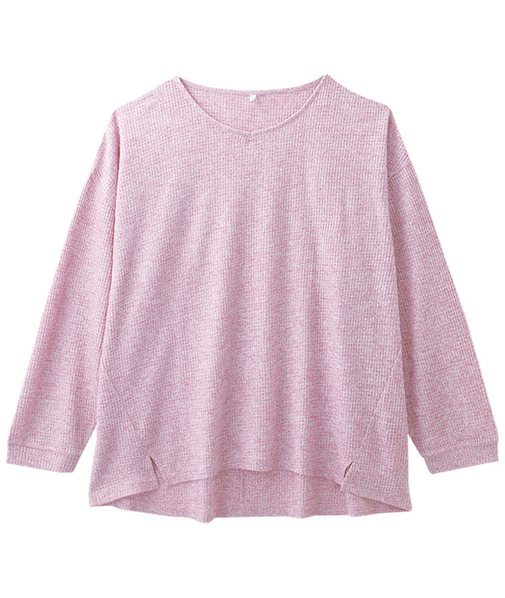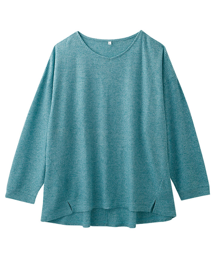 【すっきりメイクトップス】杢ワッフルVネックスリット入りプルオーバー
