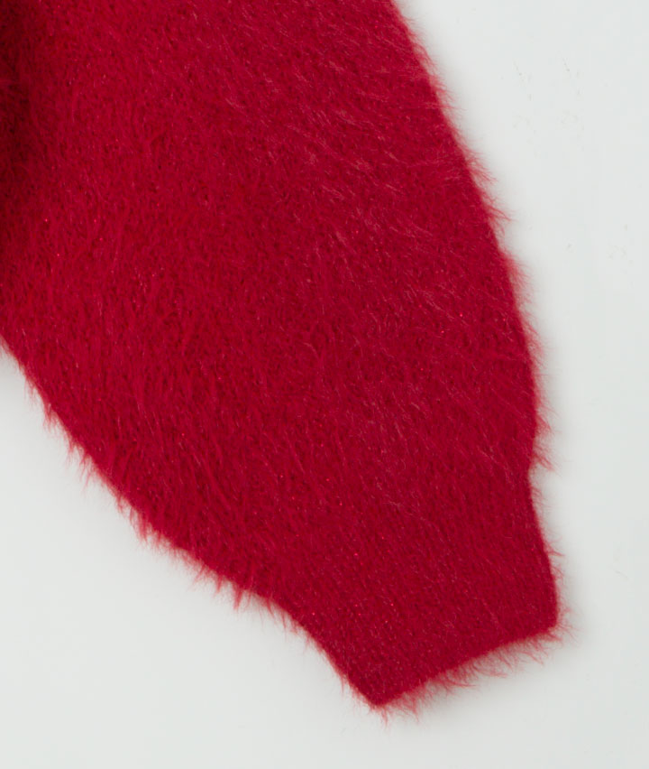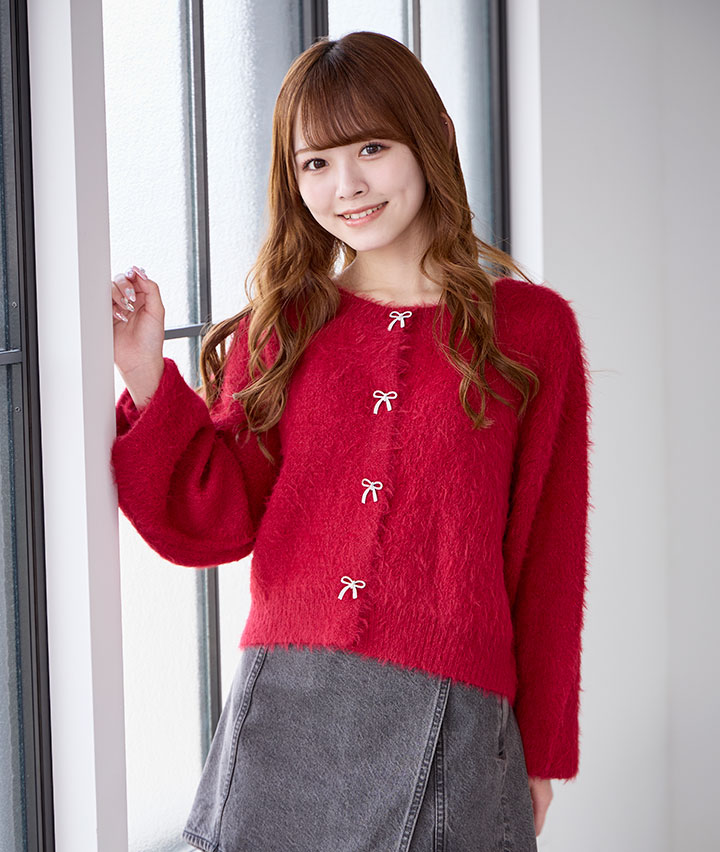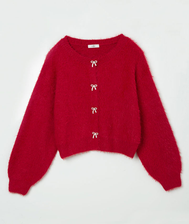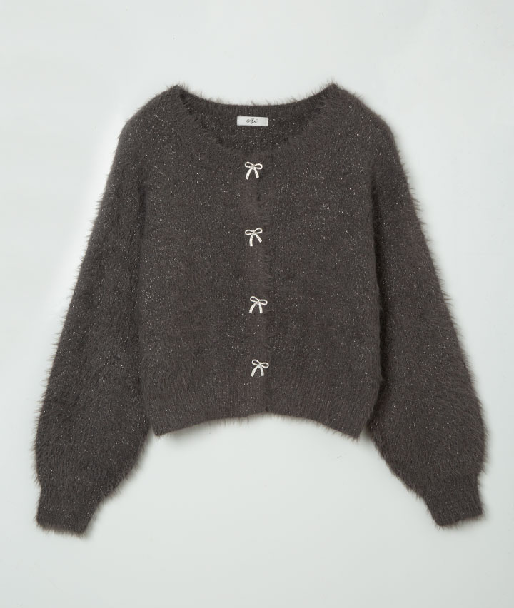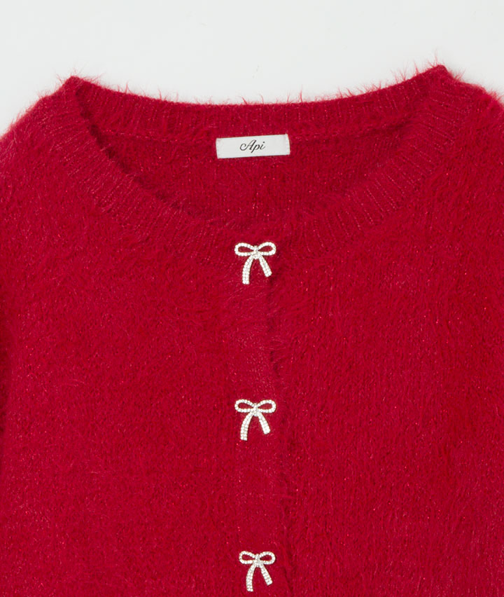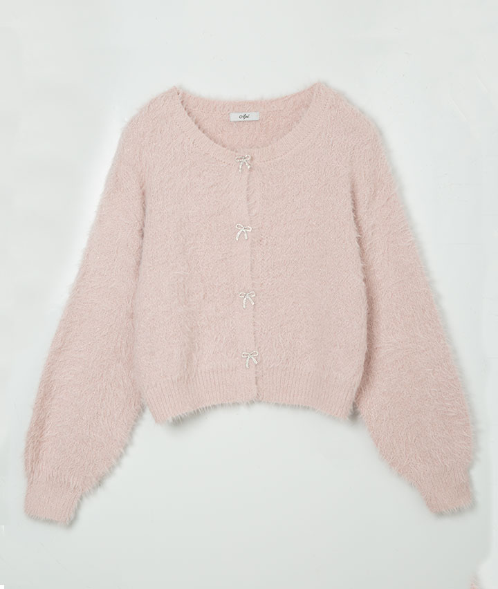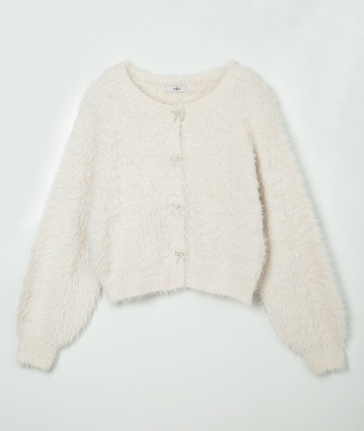 ・ふわふわフェザーニットにビジュー付きリボンボタンがきらめく、上品ガーリーなカーディガン。羽織りにもトップスにも使える、着回し力抜群の一枚です。