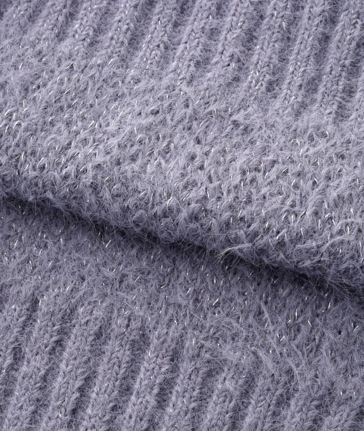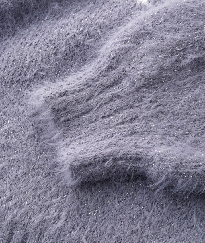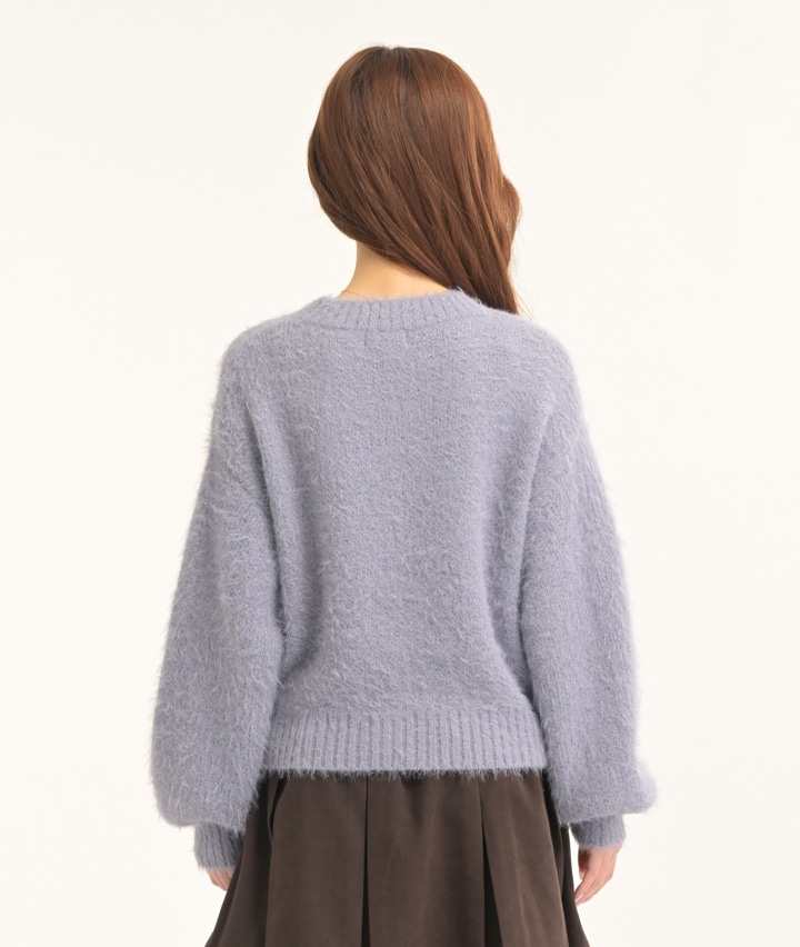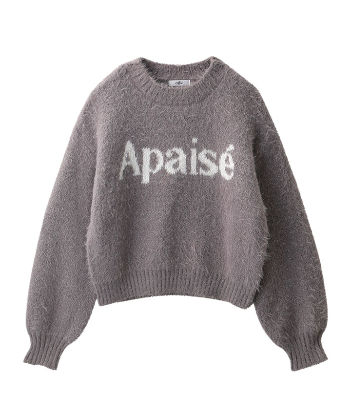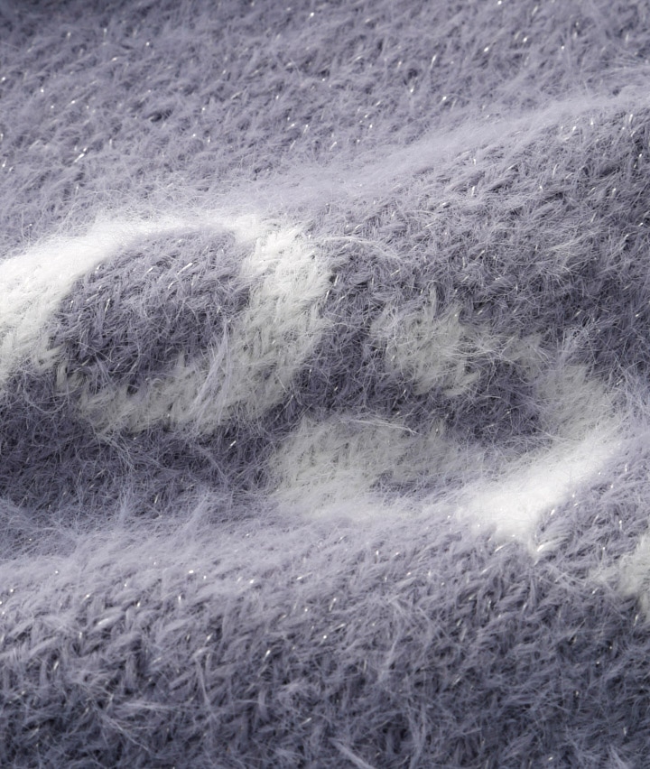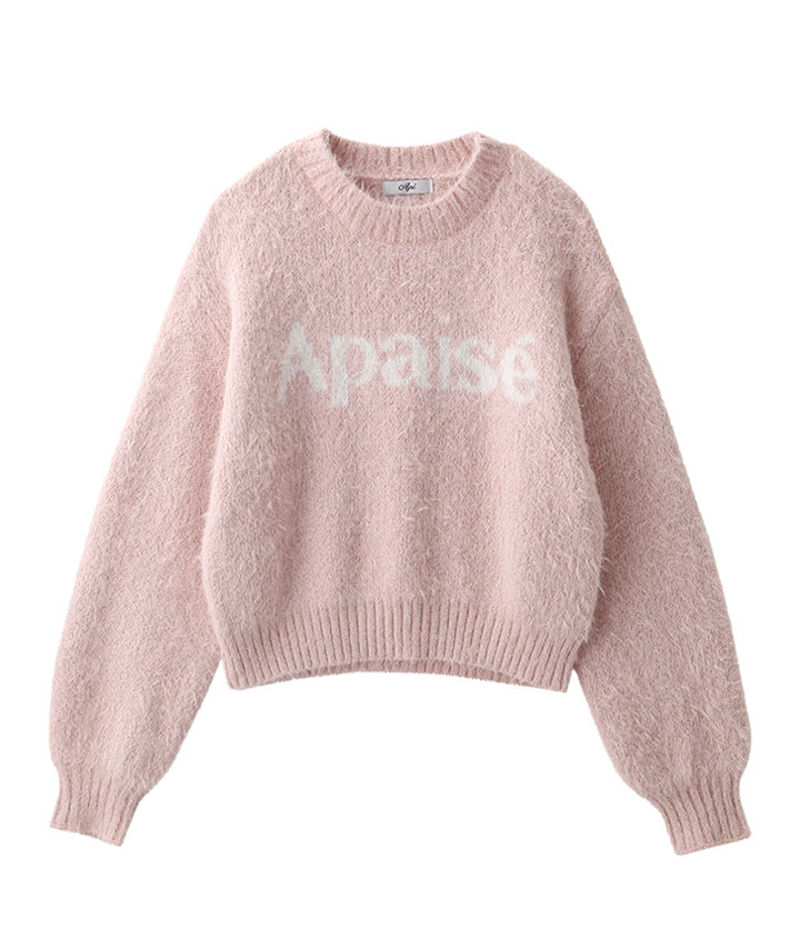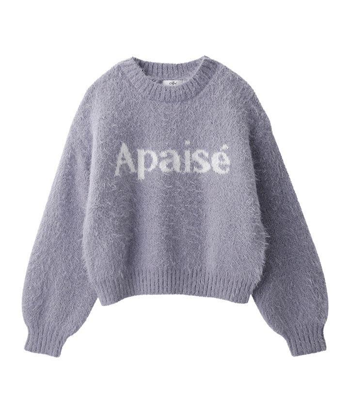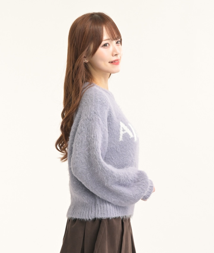 ・ふんわりフェザー素材のロゴニット。ボリューム袖が華やかな印象に。