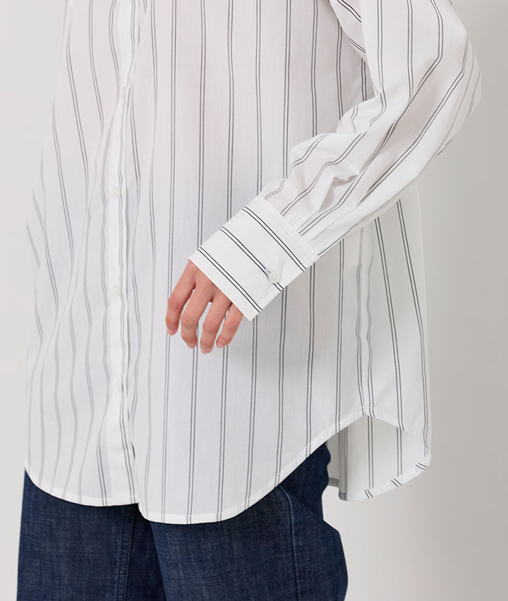 ・オーバーすぎずタイトすぎない、カジュアルにもきれい目にも着やすいサイズ感にこだわり、着丈はやや長めに設定しレイヤリングも楽しめます。カジュアルなお洋服にも合わせやすく、ほど良いキレイめ感を兼ね備えたシャツ