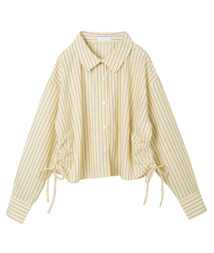・サイドに施されたダブルドロストデザインが目を惹く、ストライプ柄シャツ。絞り具合を調整することで、立体感のあるシルエットやコンパクトな丈感を楽しめるのが魅力です。