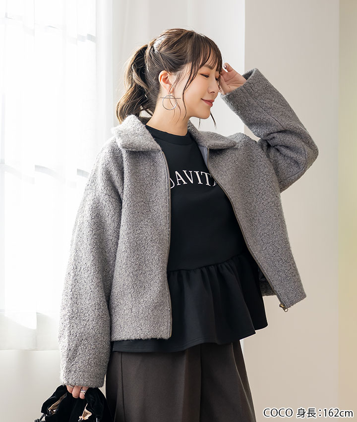 ・冬らしい素材のループボア素材はモコモコ素材で映えるアウター商品です。カジュアルに着ていただけるアイテムです。