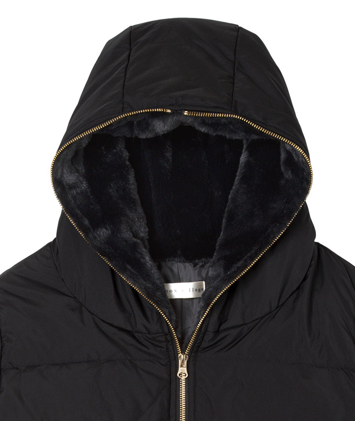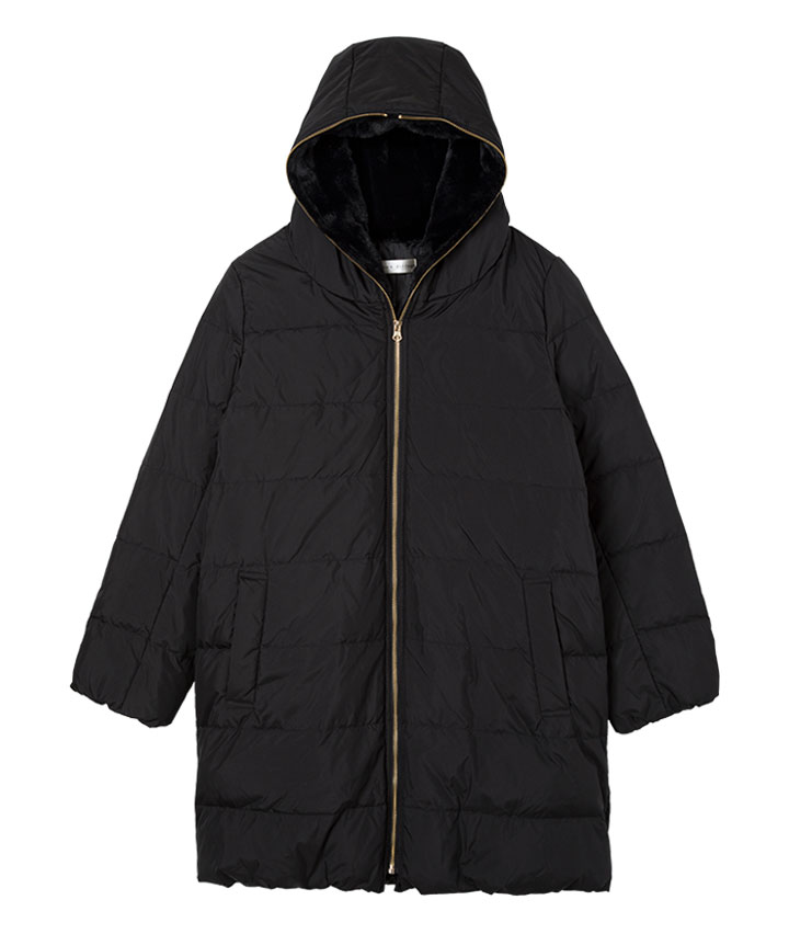 ・襟部分にエコファー素材をあしらい、ゴールドのファスナーが特徴的なダウンコートです。