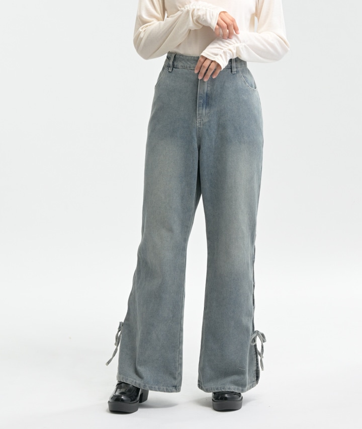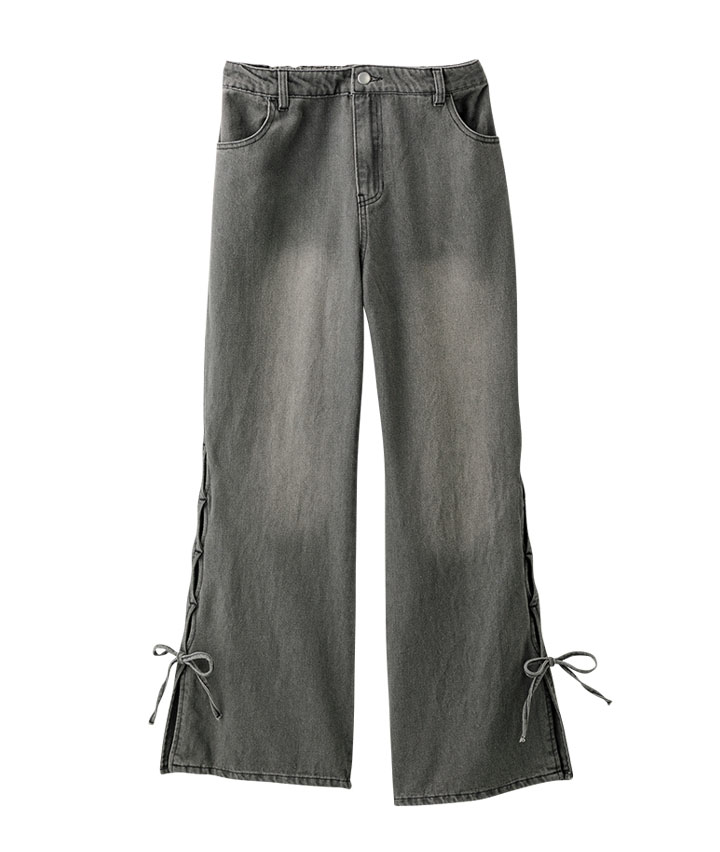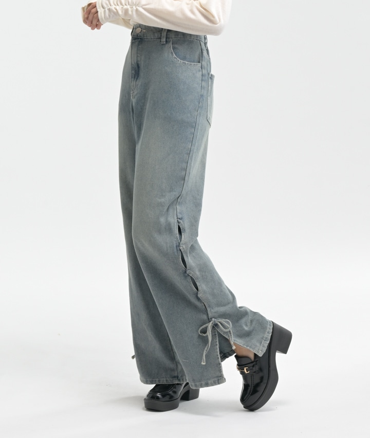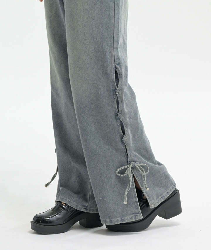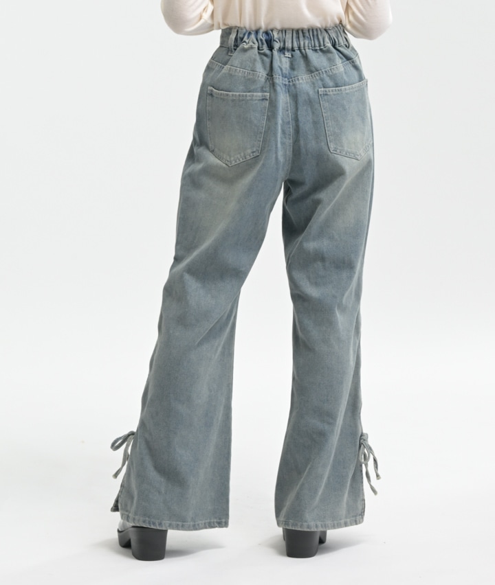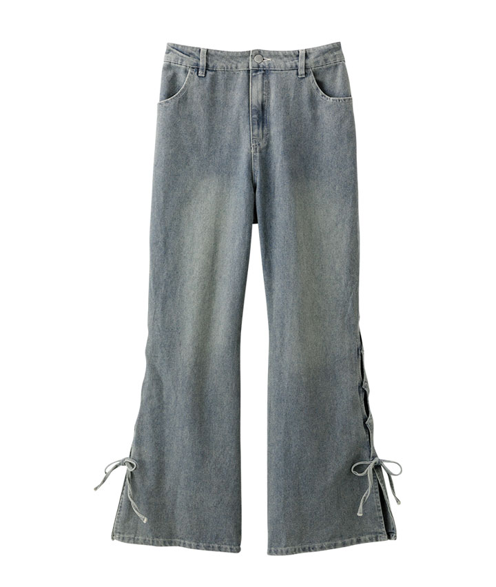 ・スソのスリットデザインとリボンが特徴のデニムパンツです