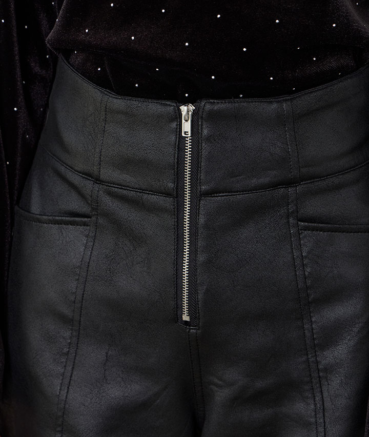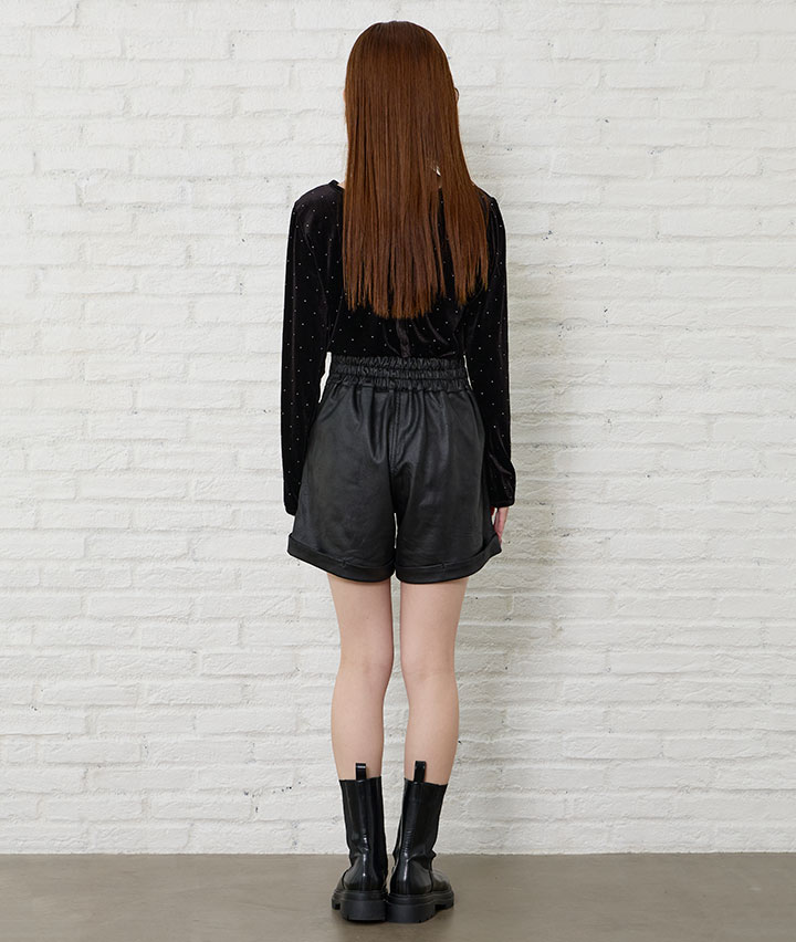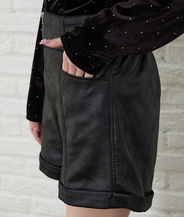 ・ジップ付きの合皮ショートパンツ。1枚でキメれるおすすめアイテムです。