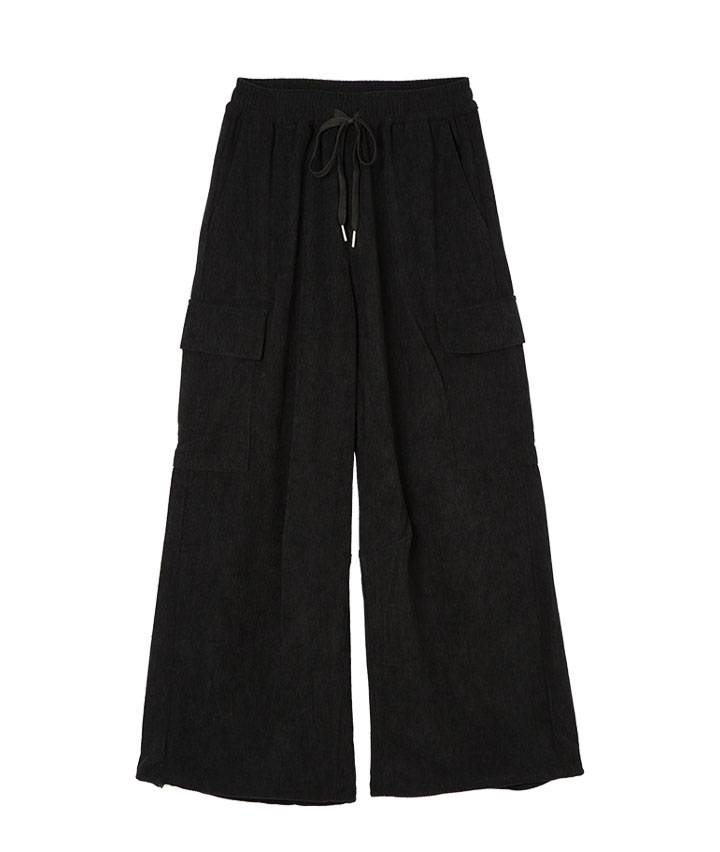 ・コーデュロイ素材のカーゴパンツ。ウエストゴムで履きやすく、裾が絞れて気分で変える2WAY仕様です。