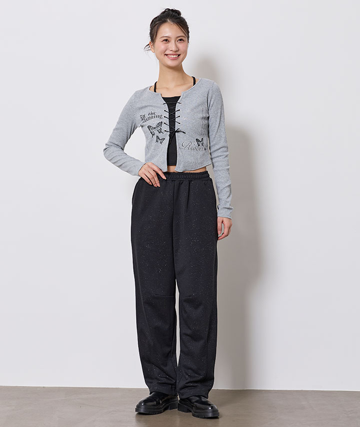 ・ラメ裏毛のスエットパンツ。バックのラメプリントがポイントです。