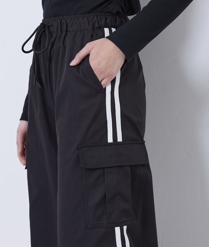 ・トレンド感たっぷりのラインデザインが目を引くカーゴパンツ。落ち感のあるエステルツイル素材を使用し、カジュアルながらもすっきりとした印象に仕上げました。