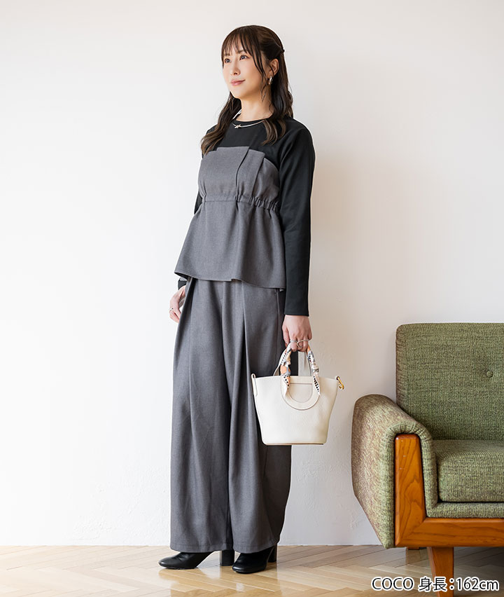 ・タック入りのワイドパンツはキレイ目な着こなしのアイテムで別売りのビスチェ風プルオーバーとセットアップで着ていただけます。