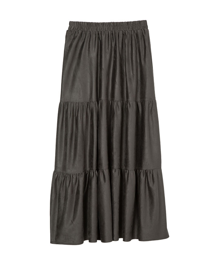 ・今年らしいスエード生地のウエストゴムで履きやすいティアードスカートです。