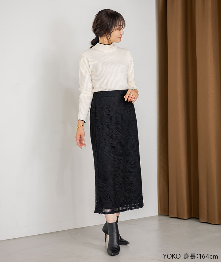 ・春らしいレース生地のナロースカートで気分も春めく1着です。