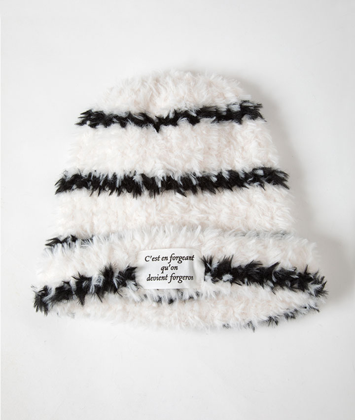 ・モノクロボーダーの配色が印象的な、柔らかいフワフワ素材のニット帽子。被るとボリュームのあるフォルムになり小顔効果も演出。