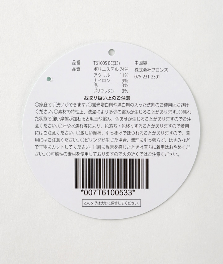 ・ポリエステル74% アクリル11% ナイロン9% 毛3% ポリウレタン3%