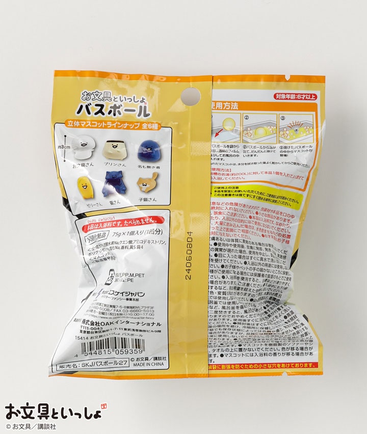 ・マスコット入り入浴剤。お文具さんたちがバスボールになって登場!ひのきの香りのバスボールをお風呂に入れるといずれかのマスコットが出てきます♪何が出てくるかは、入浴剤がとけてからのお楽しみ!マスコットは全6種類。