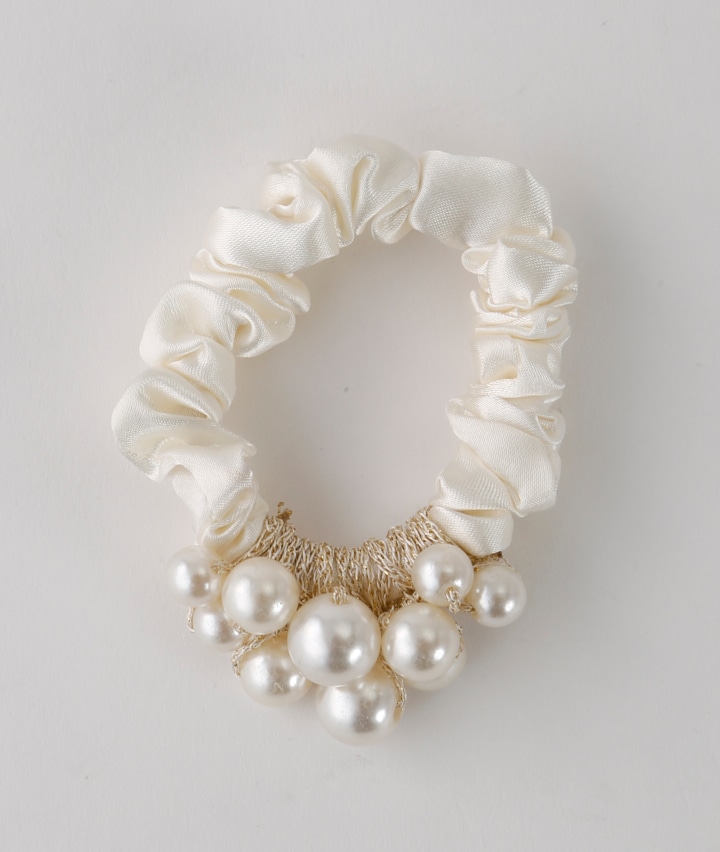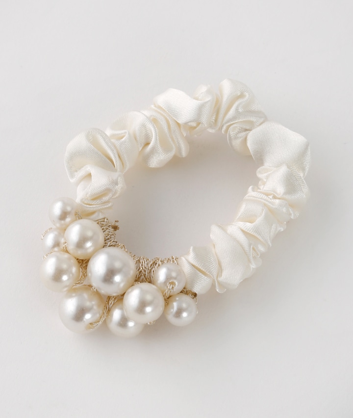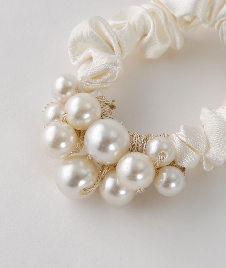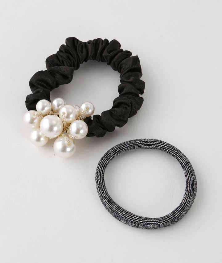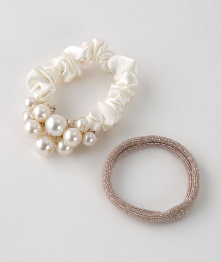 ・上品な光沢のあるサテン素材に大粒のパールをふんだんにあしらったヘアゴムです。きらめくラメゴムとのセットなので、その日の気分やコーデに合わせて単品でも重ね使いでも楽しめます。普段使いはもちろん、結婚式やパーティーなどのオケージョンにもぴったりです。