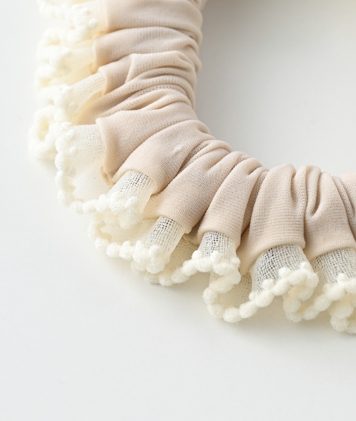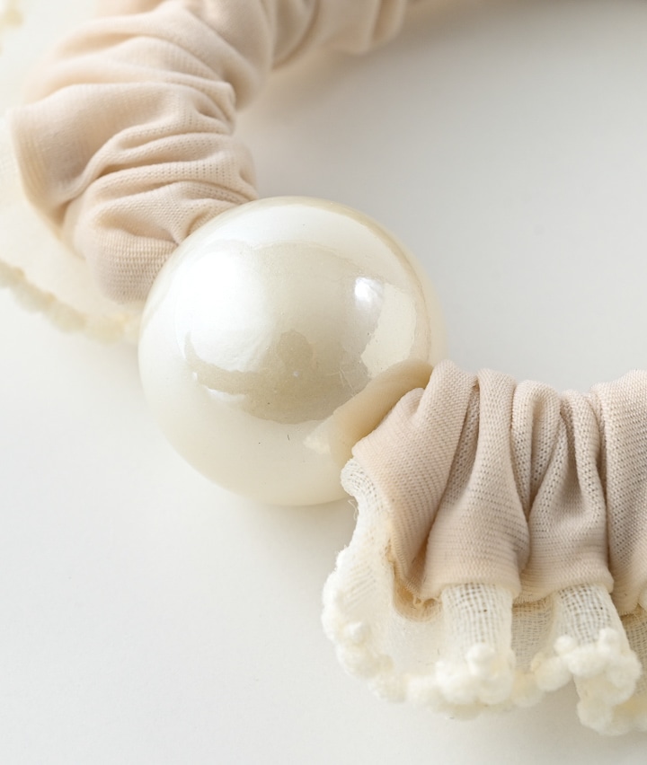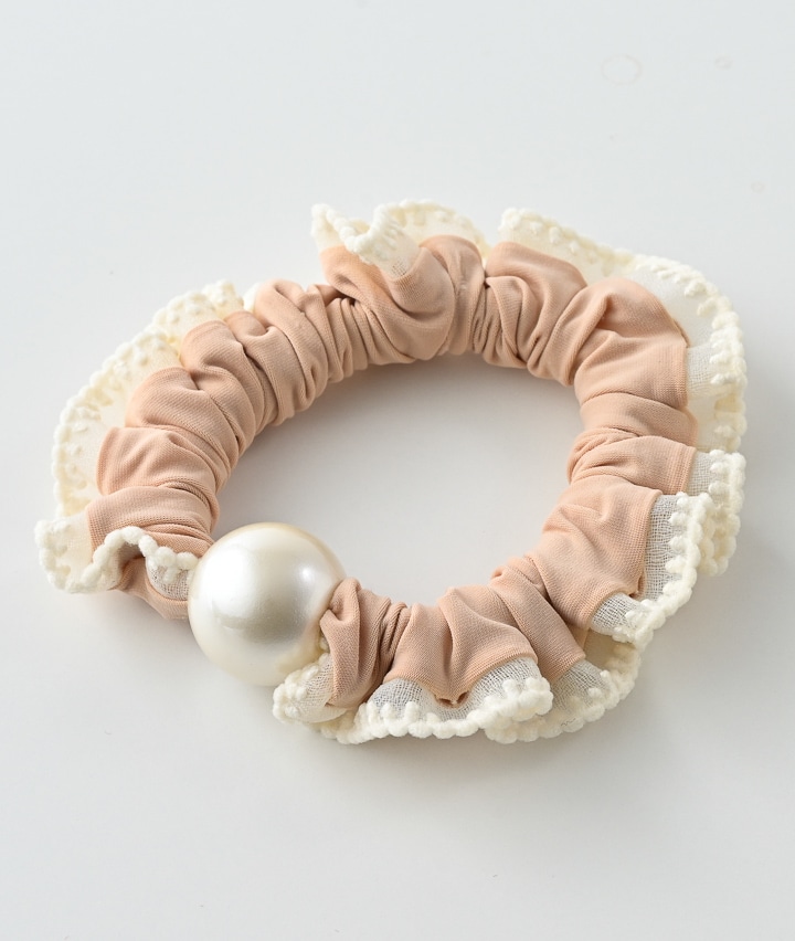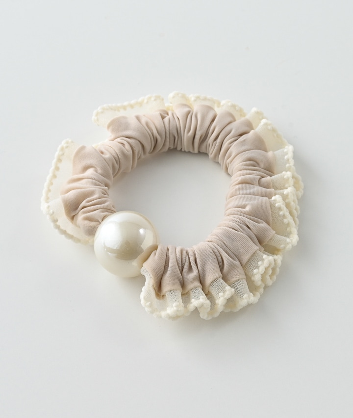・華やかなフリルデザインにパールをあしらったシュシュです。ふんわりと広がるフリルが髪をやさしくまとめながら女性らしい印象をプラス。ナチュラルなカラー展開で、カジュアルからオフィスシーンまで幅広く活躍します。