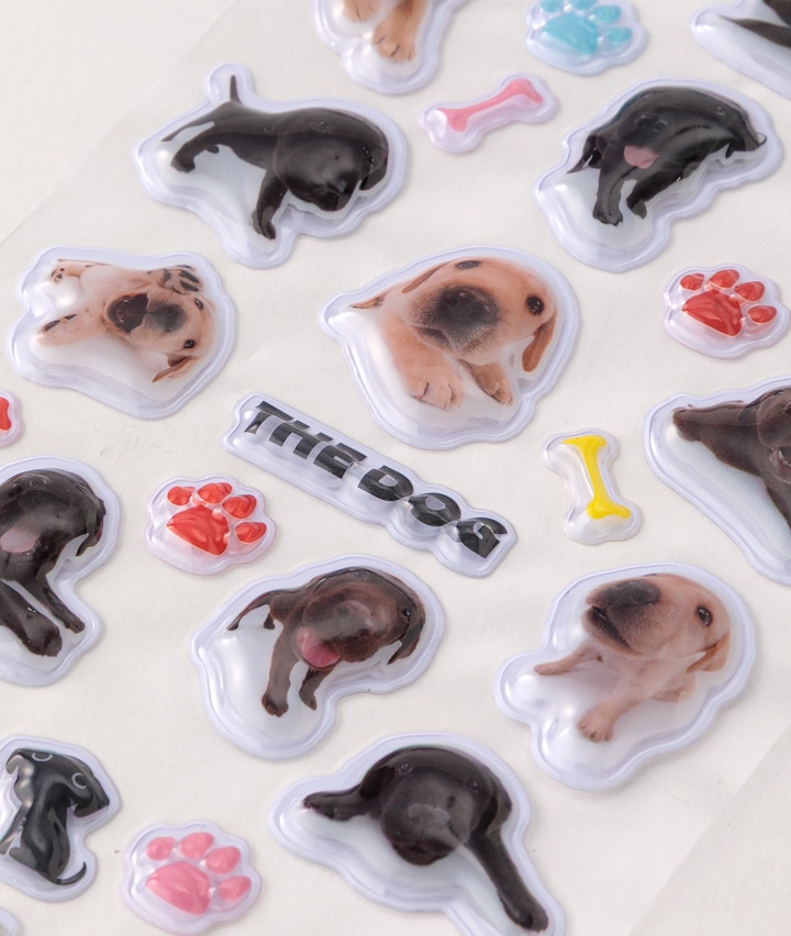 ・THE DOGシリーズからドッグ&キャットのぷっくり素材のシールが登場です。硬い素材のシールなので、凹まずかわいいデザイン。