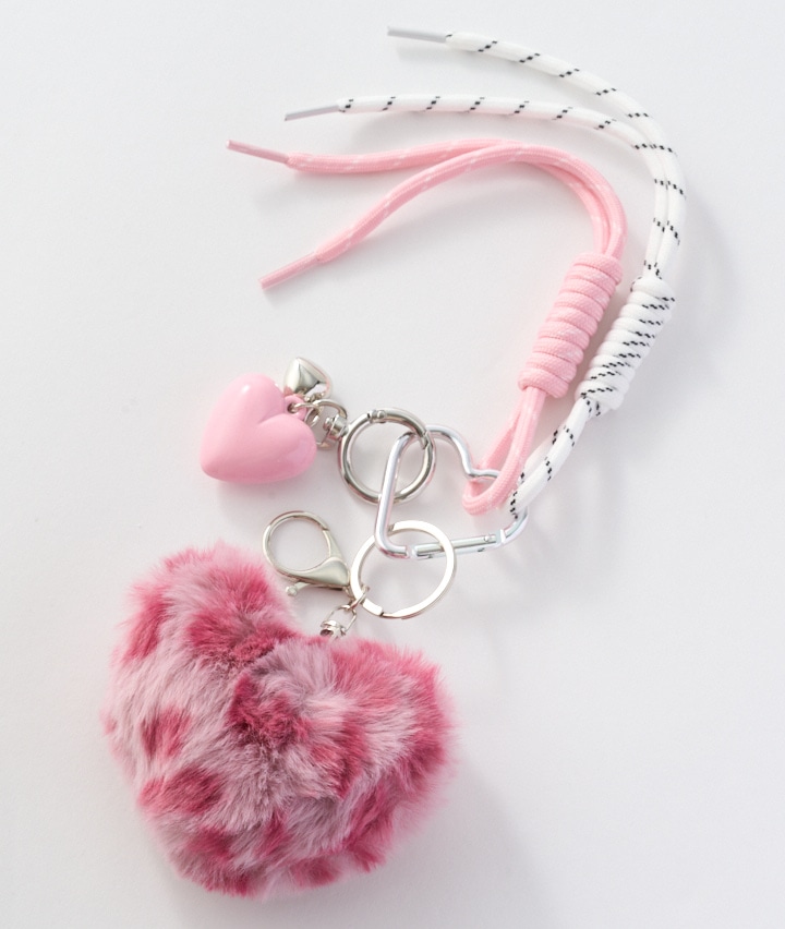 ・トレンドのコードとヒョウ柄をハート型のファーと組み合わせたチャーム。