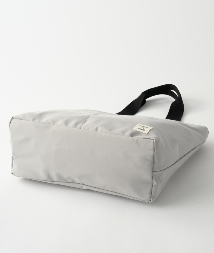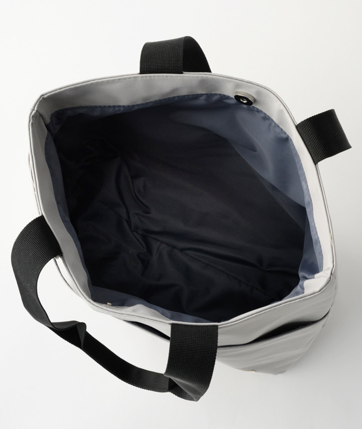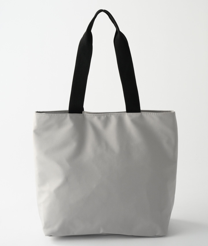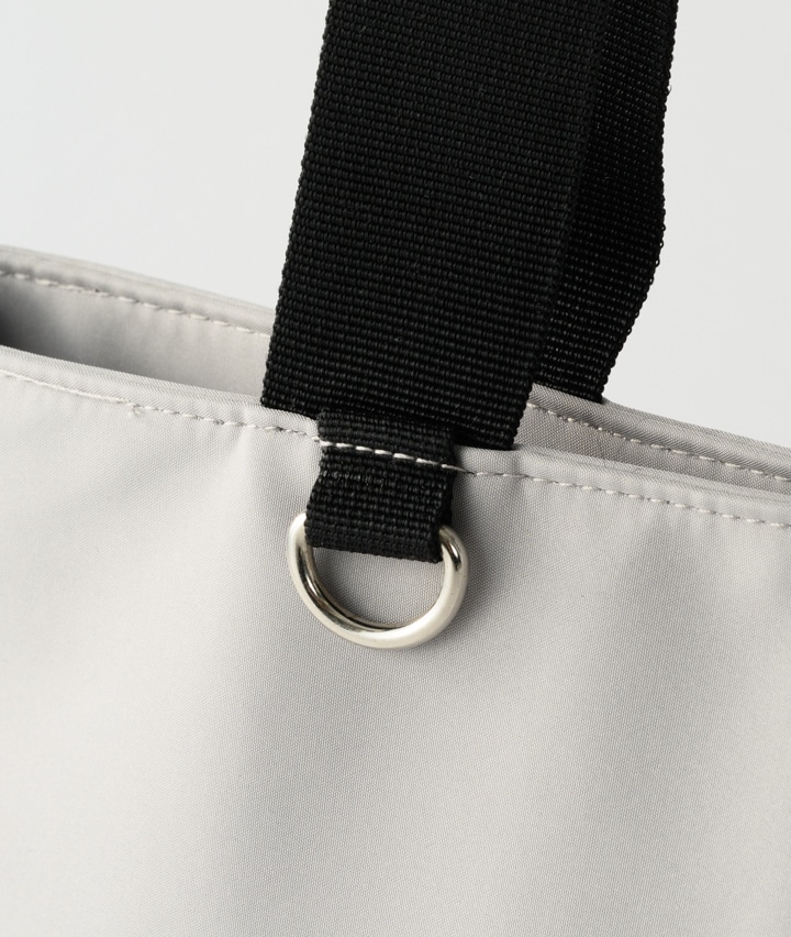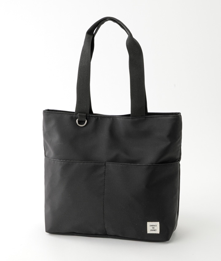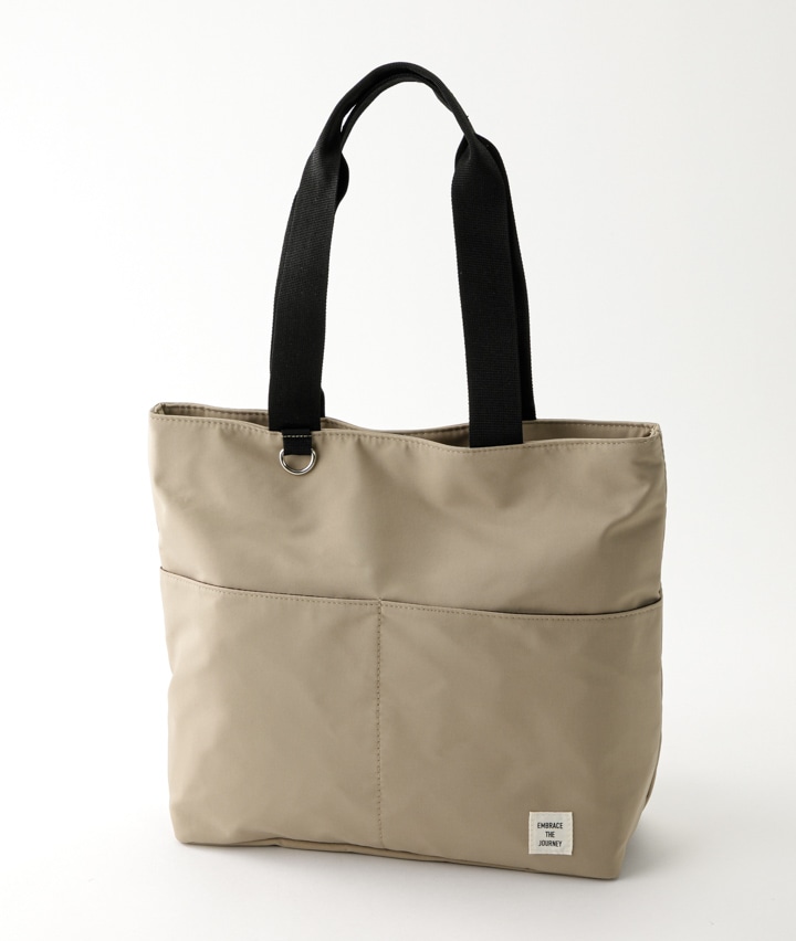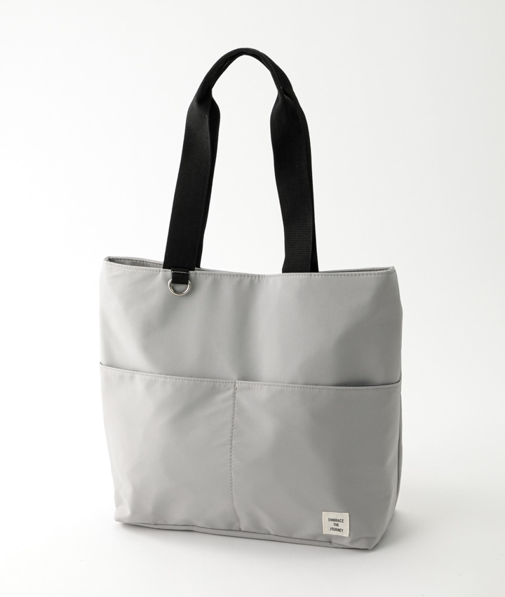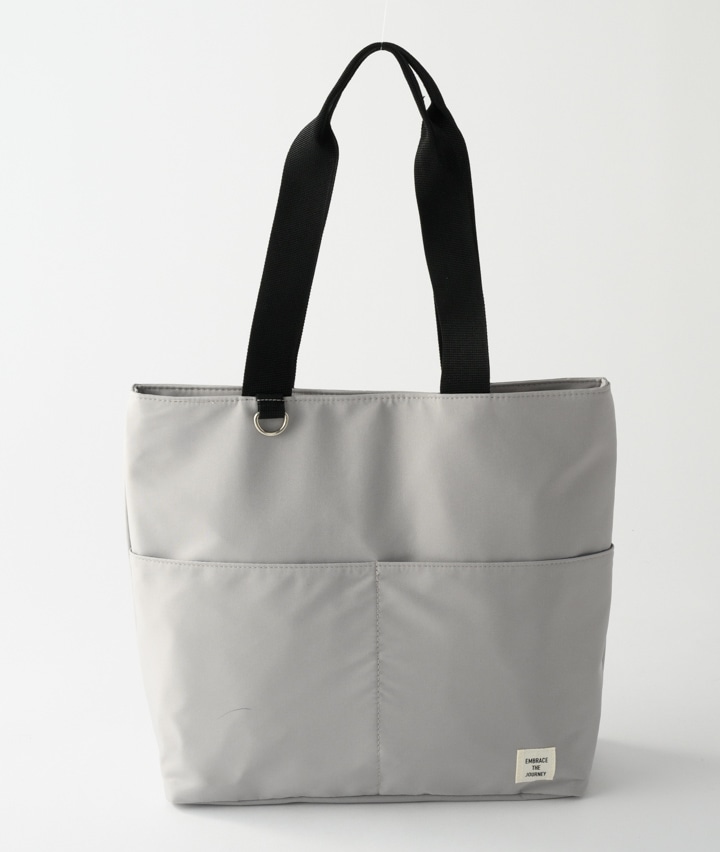・ポリエステル素材をナイロン風に加工した、光沢感や質感が高級感ある仕上がりのトートバッグです。前面にポケットが付いています。D管がついており、チャームやマスコットをつけて自分好みにカスタマイズ可能◎