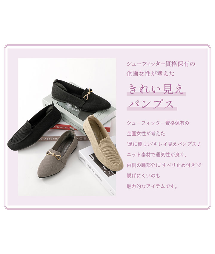 ・シューフィッター資格保有の企画女性が考えた「足に優しい」キレイ見えパンプス。ニット素材で通気性が良く、踵内側に滑り止めを使用して脱げずらい魅力的なアイテムです。