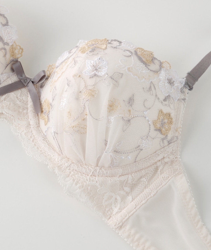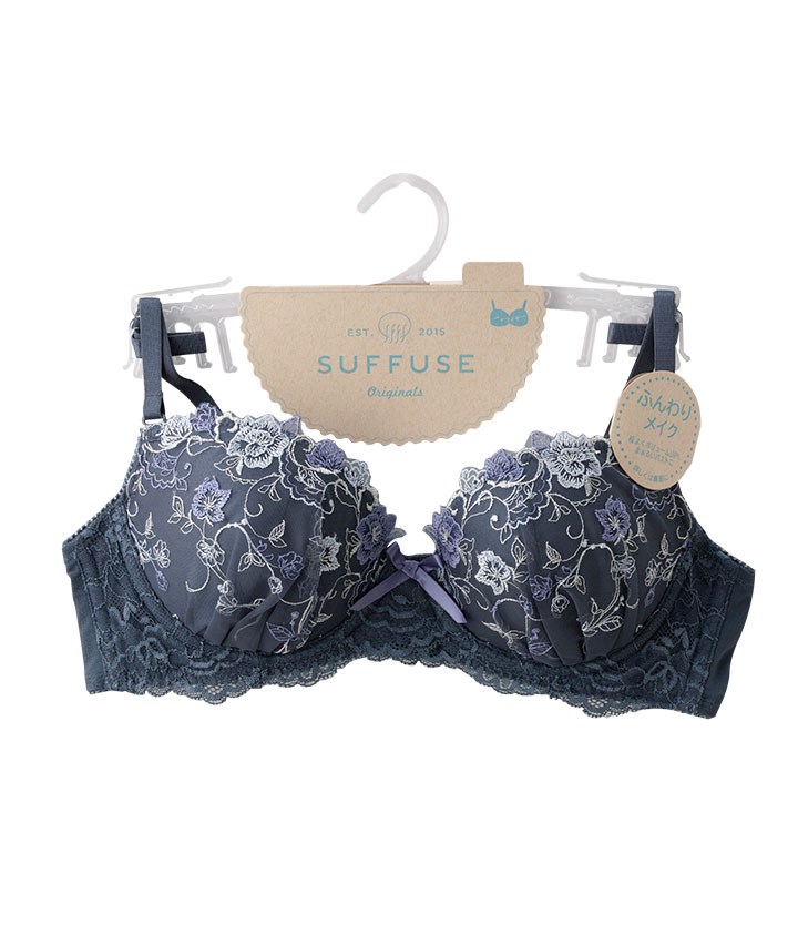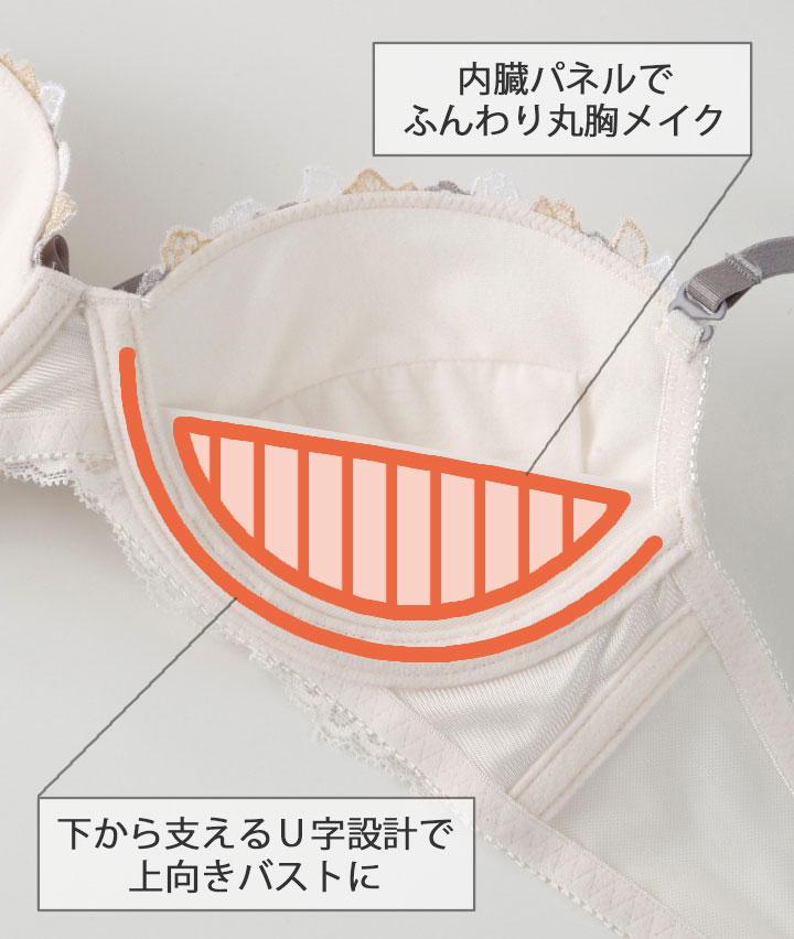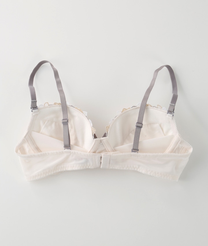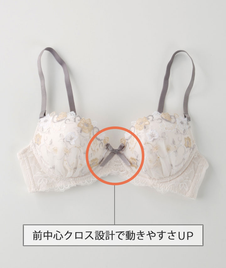 ・U字パターンとパワーネット内蔵でバストを下から持ち上げて「ふんわり」まあるくメイク!前中心がクロス仕様で動きやすさUP。ナチュラルな配色感が大人可愛い花柄レースのノンワイヤーブラジャー。