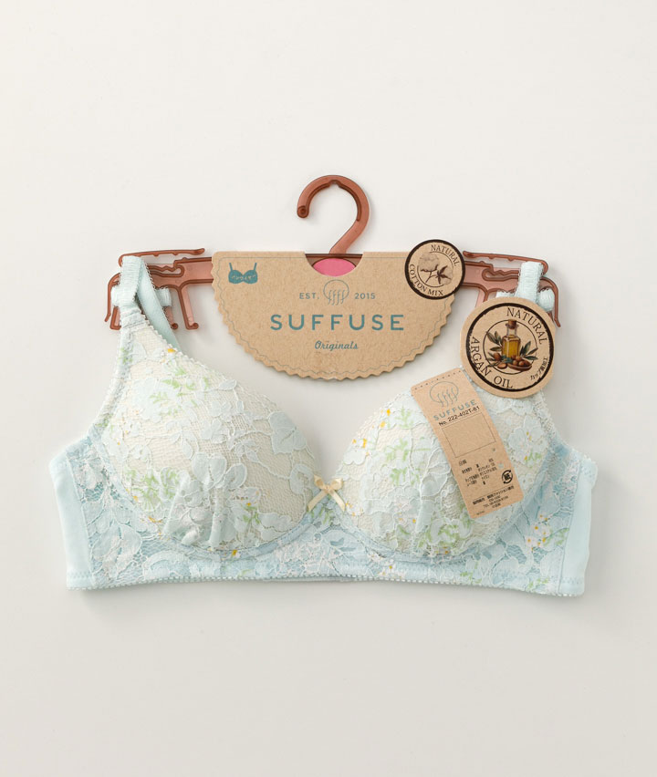 ・花柄プリントのレースがナチュラル可愛いカジュアルノンワイヤーブラジャー。カップ裏はアルガンオイル加工&コットンMIX素材でお肌に優しいつけごこち。