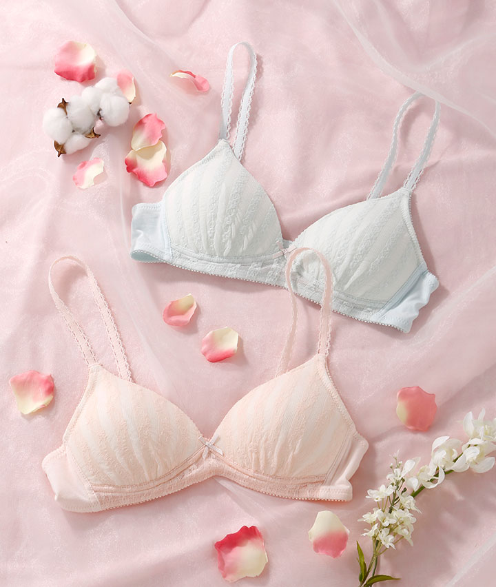 ・ふわふわ立体レースがナチュラルかわいいカジュアルノンワイヤーブラジャー。ローズオイル加工で気分華やぐ&カップ裏コットンMIX素材でお肌に優しいつけごこち。