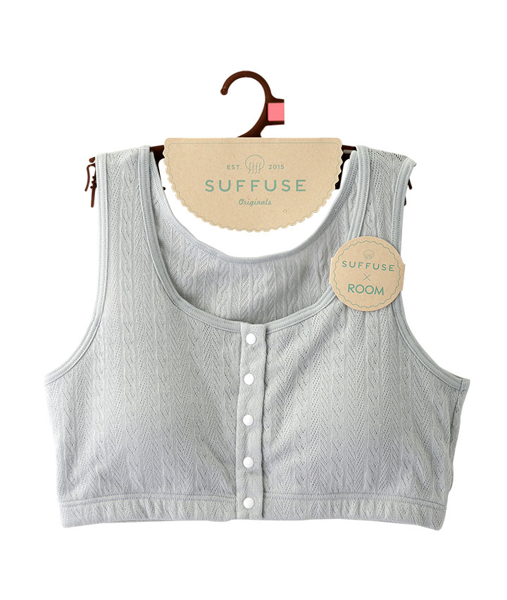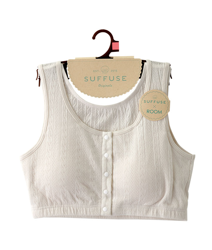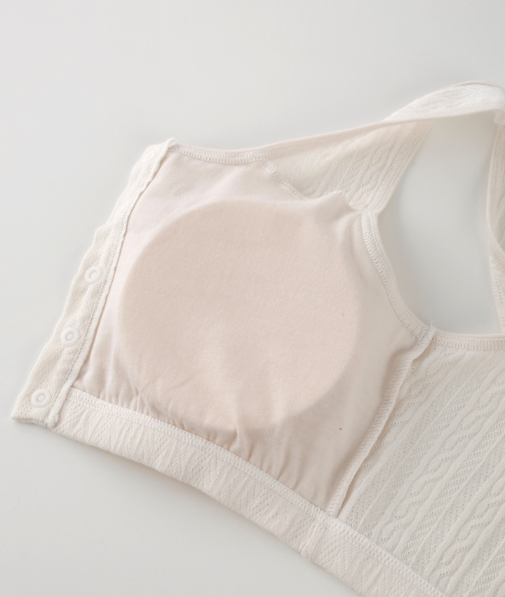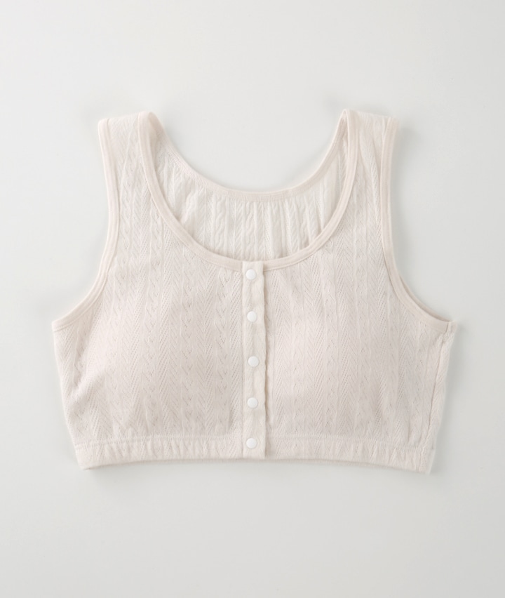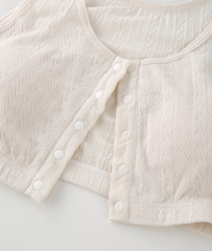 ・綿100%のメッシュ素材で、軽くてやさしい着心地のルームインナー。着脱しやすい前開き仕様。おうちでのリラックスタイムに。