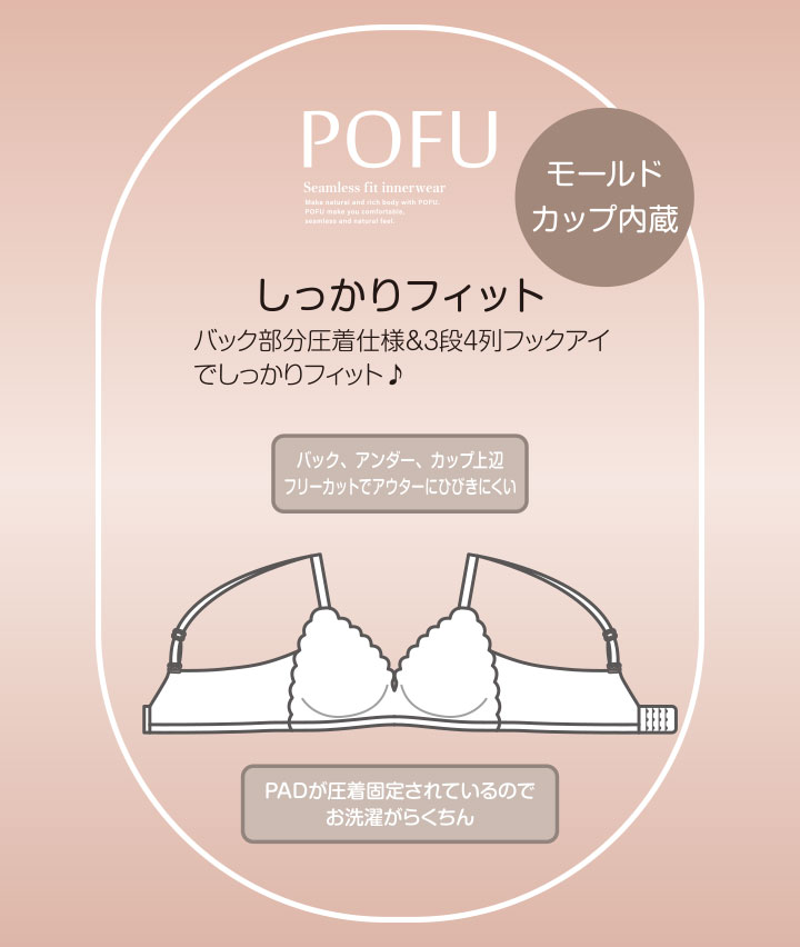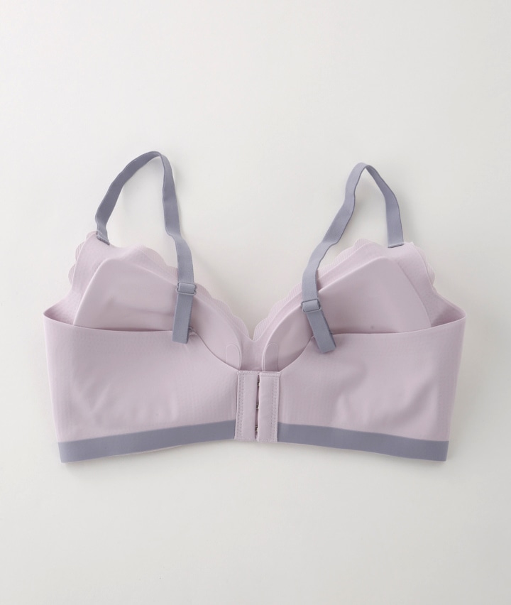 ・縦にも横にも伸びが良い2WAY仕様&ふわふわカップで気持ちよくラクな着けごこち。圧着固定仕様のパッドでズレずにしっかりフィット。バック部分圧着&多段フックアイでしっかりフィット。バック、アンダー、カップ上辺フリーカットでアウターに響きにくい。機能的なのにらくちん&スカラップデザインがかわいい毎日つけたくなるニューベーシックブラジャー!