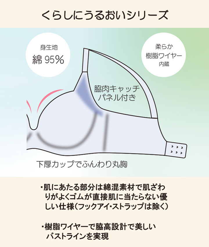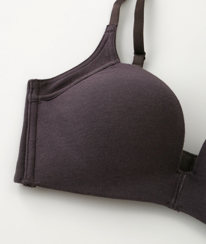 ・キレイも着心地も妥協しない。大人女子のためのメンテナンスインナー。肌に当たる部分は綿混素材で優しい仕様。やわらかい樹脂ワイヤー・下厚モールドカップ・脇高設計で着け心地はラクに、美しいバストラインを実現します。