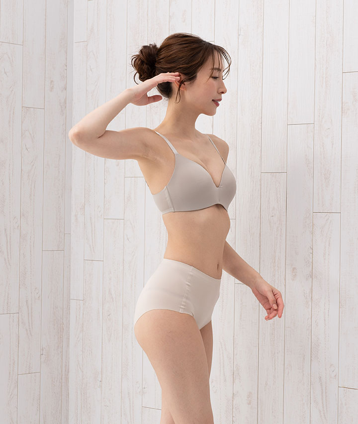 ・ぐにっと曲がるやわらかい樹脂ワイヤー入りで締め付け感は少なく、ほどよくバストを支えて立体感を作ります。素肌に溶けこむような着用感。アウターに響きにくく、ファッションの邪魔になりにくい仕様。ヒアルロン酸保湿加工でお肌にしっとりご褒美。