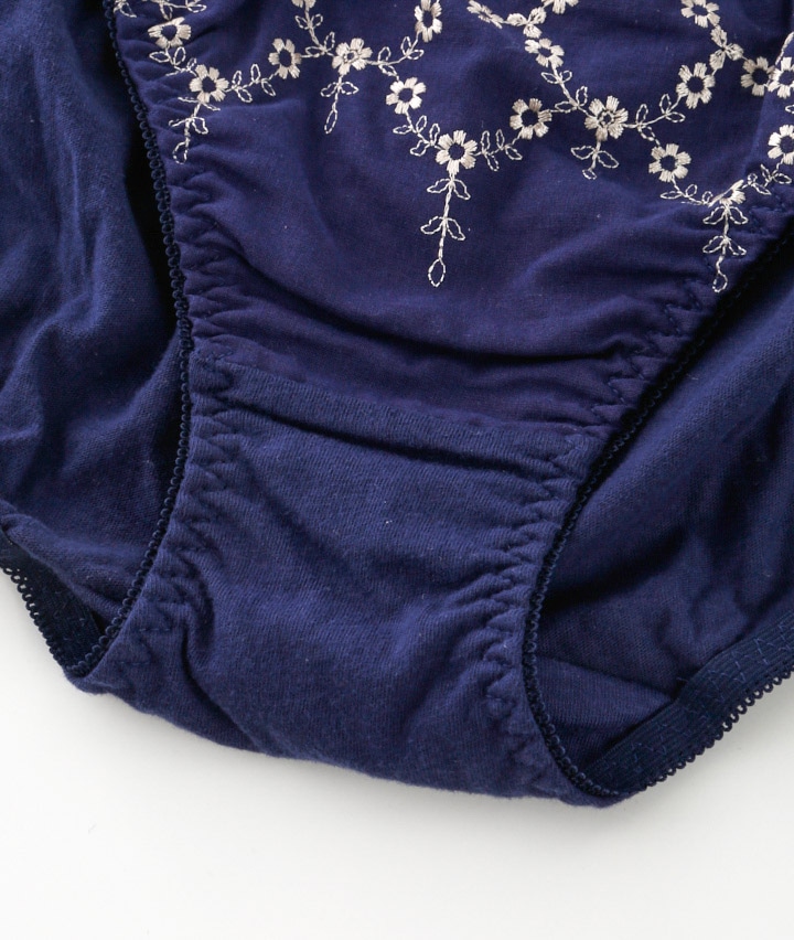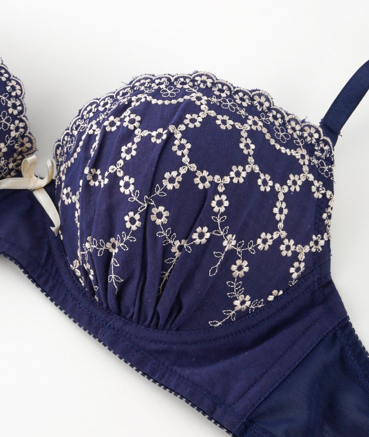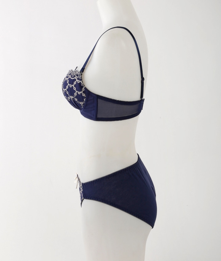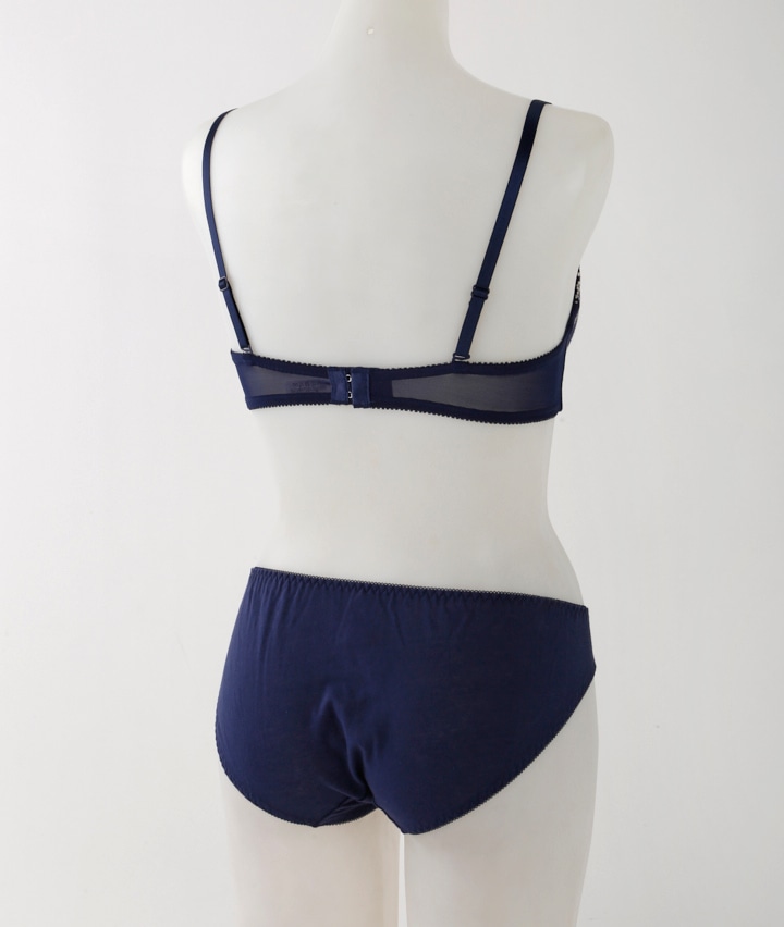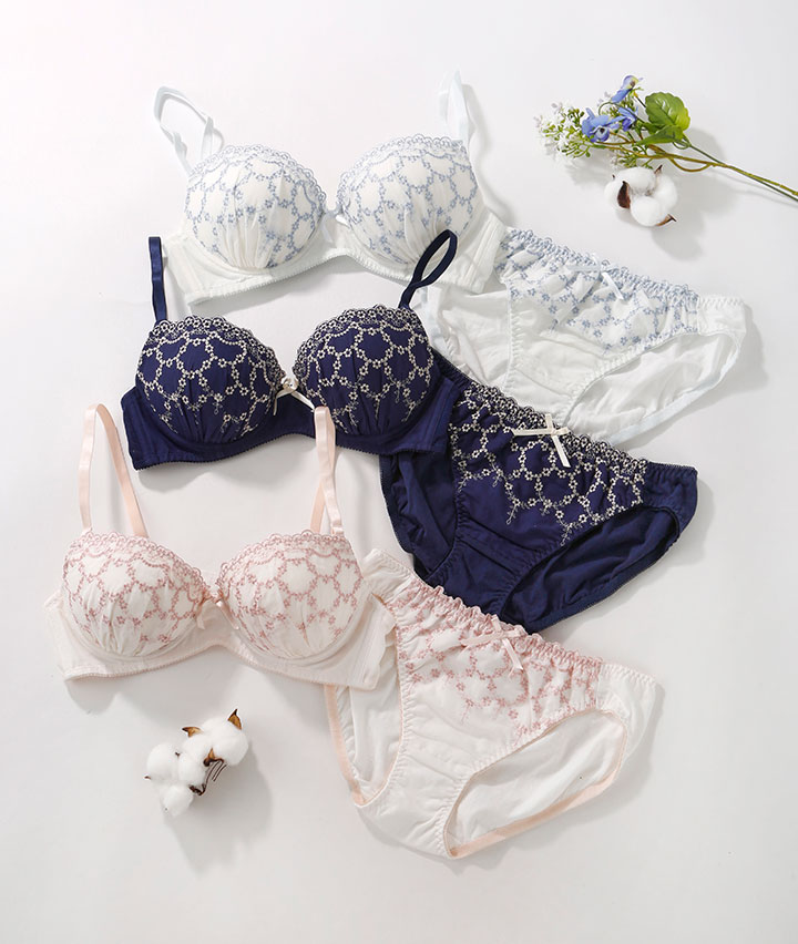 ・ガーリームード満点なふんわりかわいいコットンレースを使用。カップ裏には横流れを防止するパネル内蔵で自然な丸胸をメイク。ショーツは綿素材でお肌に優しいはき心地。