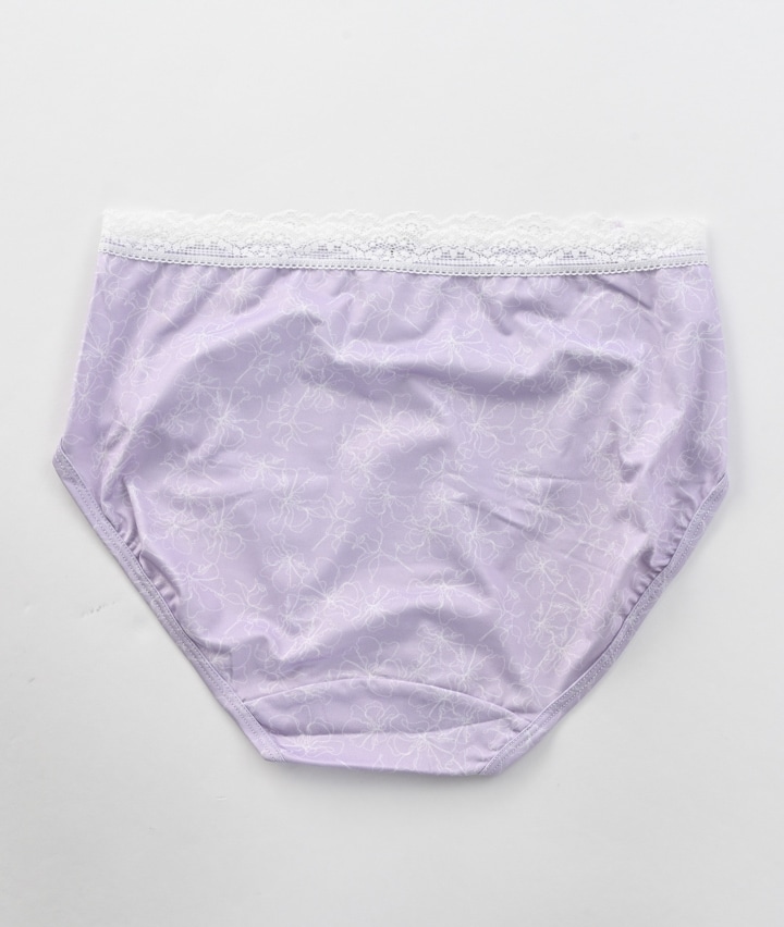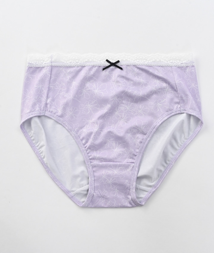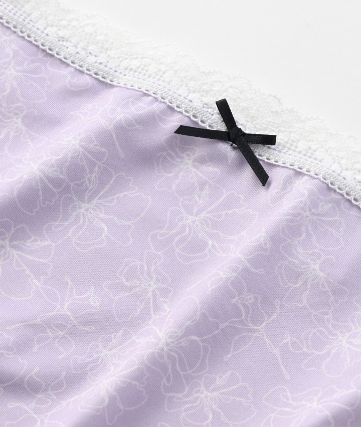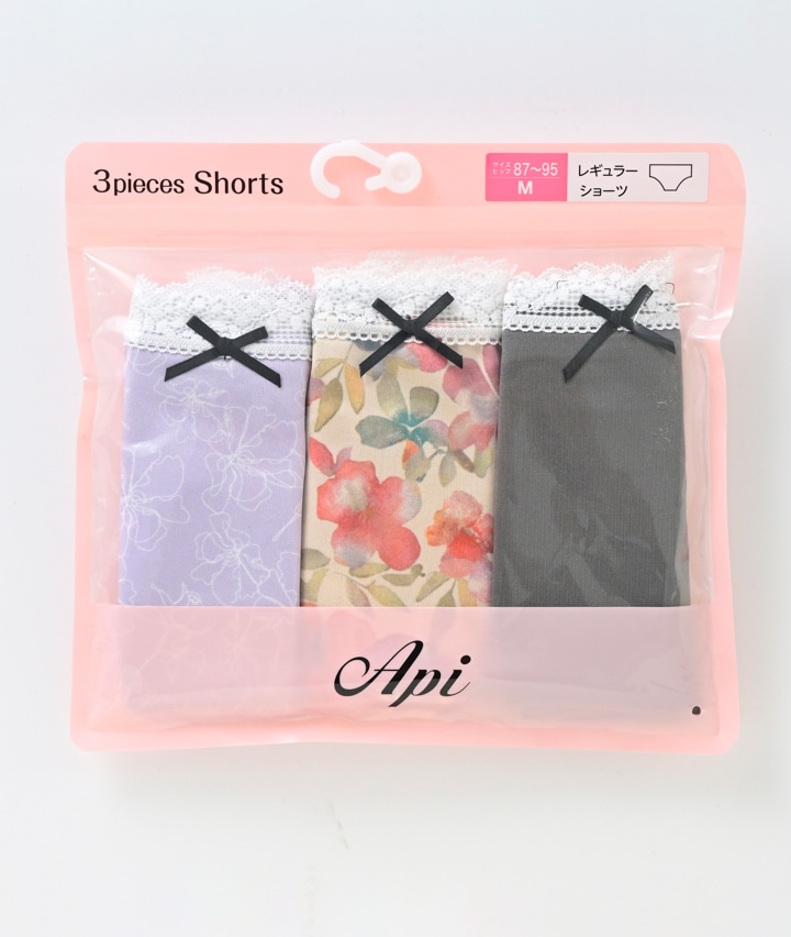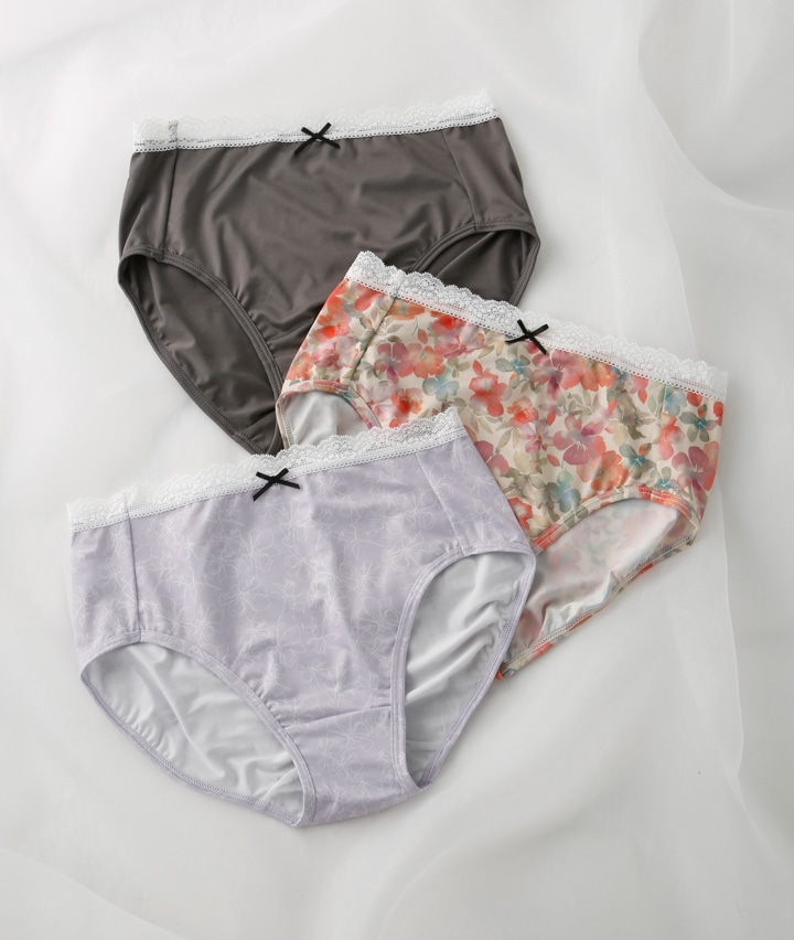 ・花柄・無地のフェミニンな3枚組レギュラーショーツ。ウエストのリボンとレースでよりかわいらしい印象に。