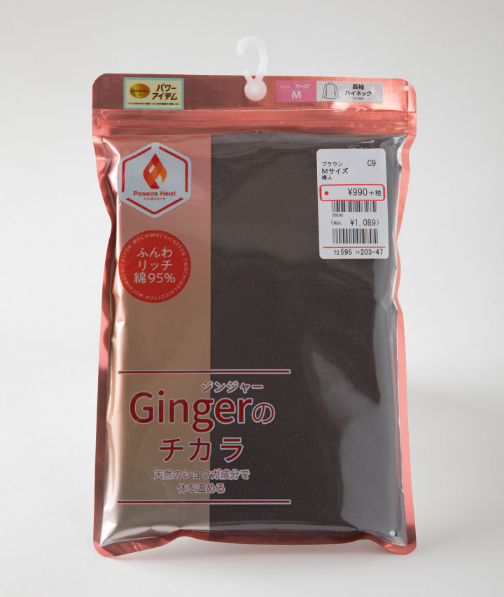 ・天然由来の生姜成分と発熱綿を使用し、両面に微起毛をかけたふんわり暖かいインナーです。総丈M59cm L61cm LL63cm