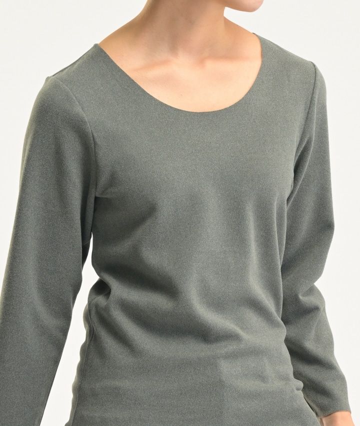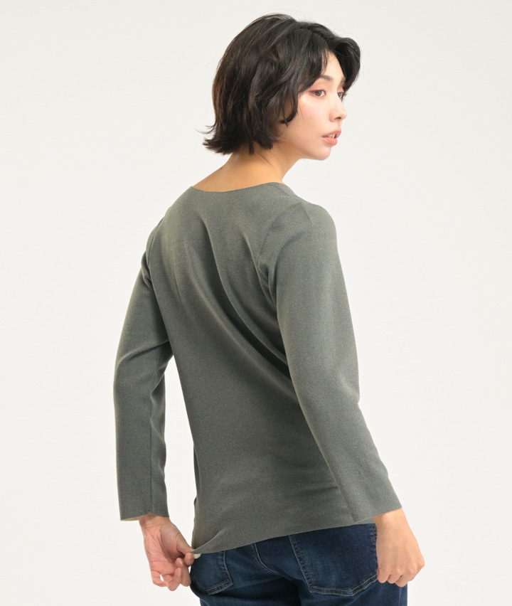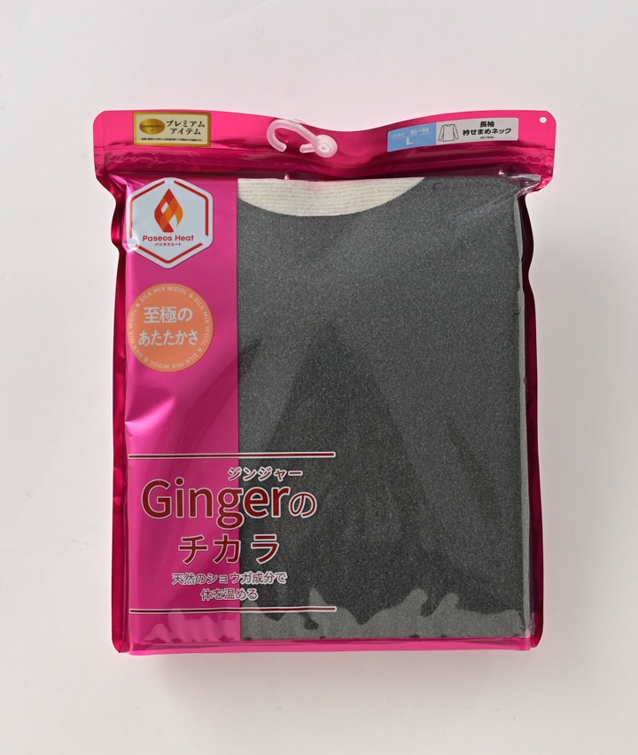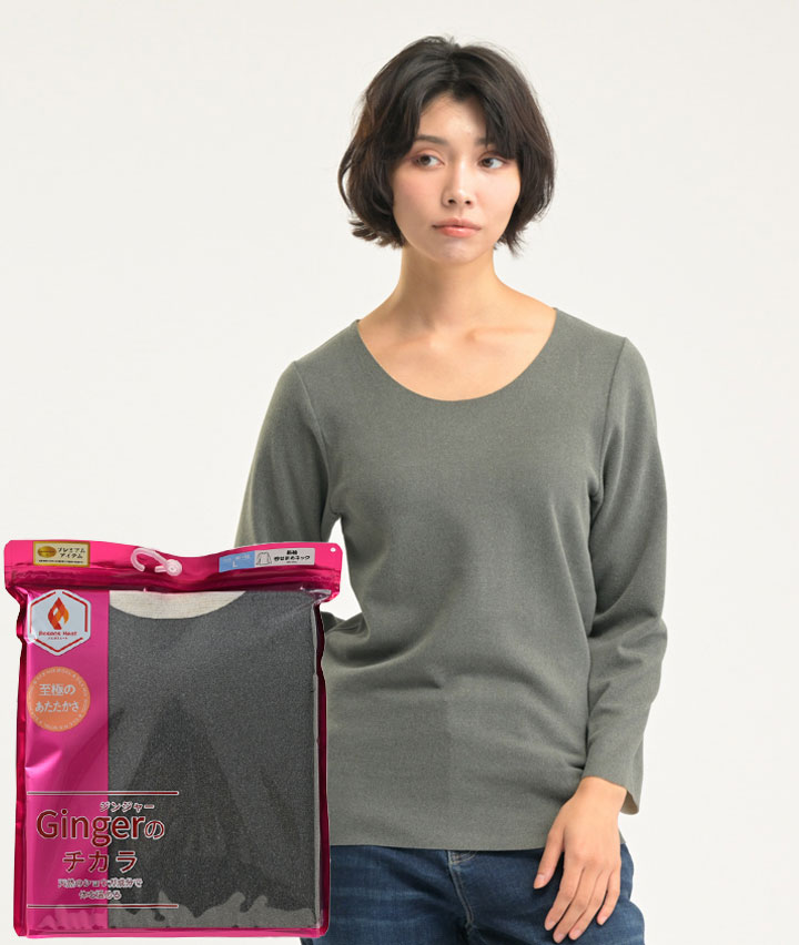 ・天然由来のショウガ成分を使用し、両面に起毛をかけてふんわり暖かいインナーです。裾に縫い目がないのでごろつきがなく快適。