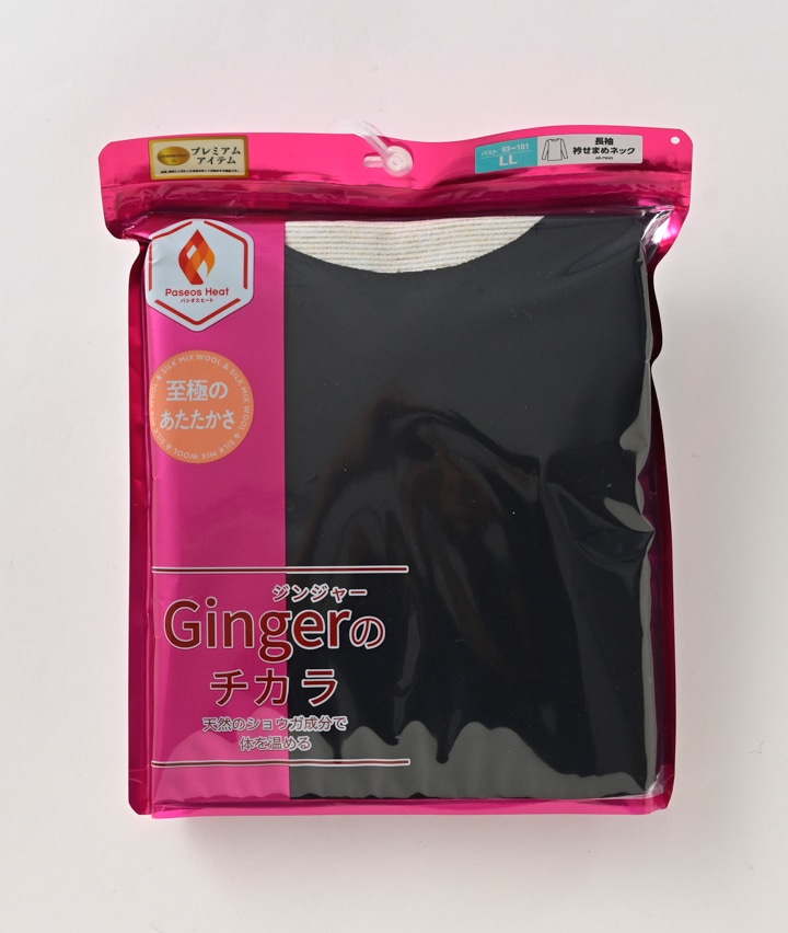 ・天然由来のショウガ成分を使用し、両面に起毛をかけてふんわり暖かいインナーです。裾に縫い目がないのでごろつきがなく快適。