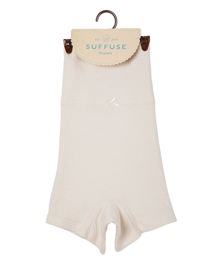 ・コットン100%でお肌に優しく、空気を含む柔らかな風合いの生地を使用したルームショーツ。お腹部分二重設計で冷え対策にも。