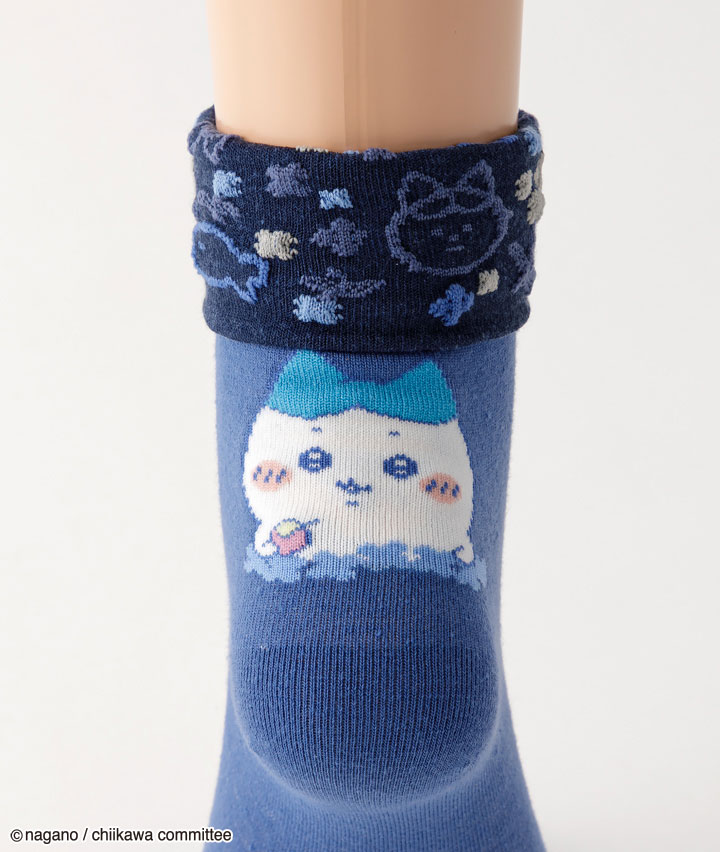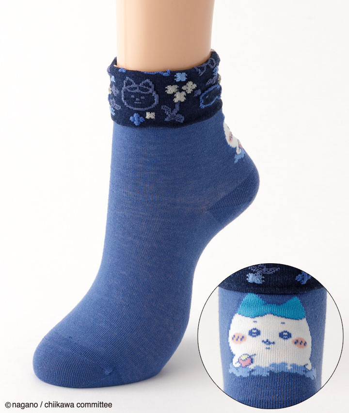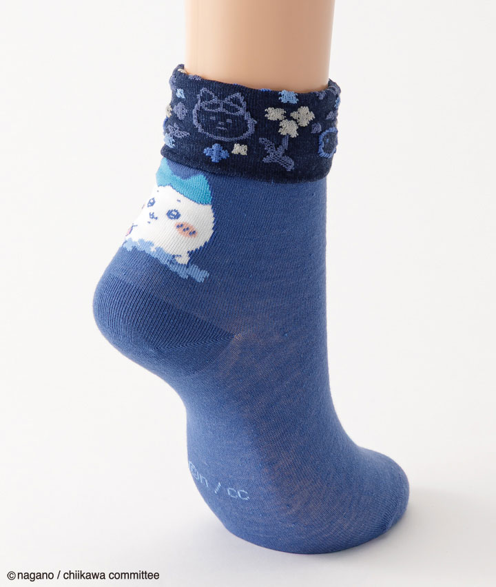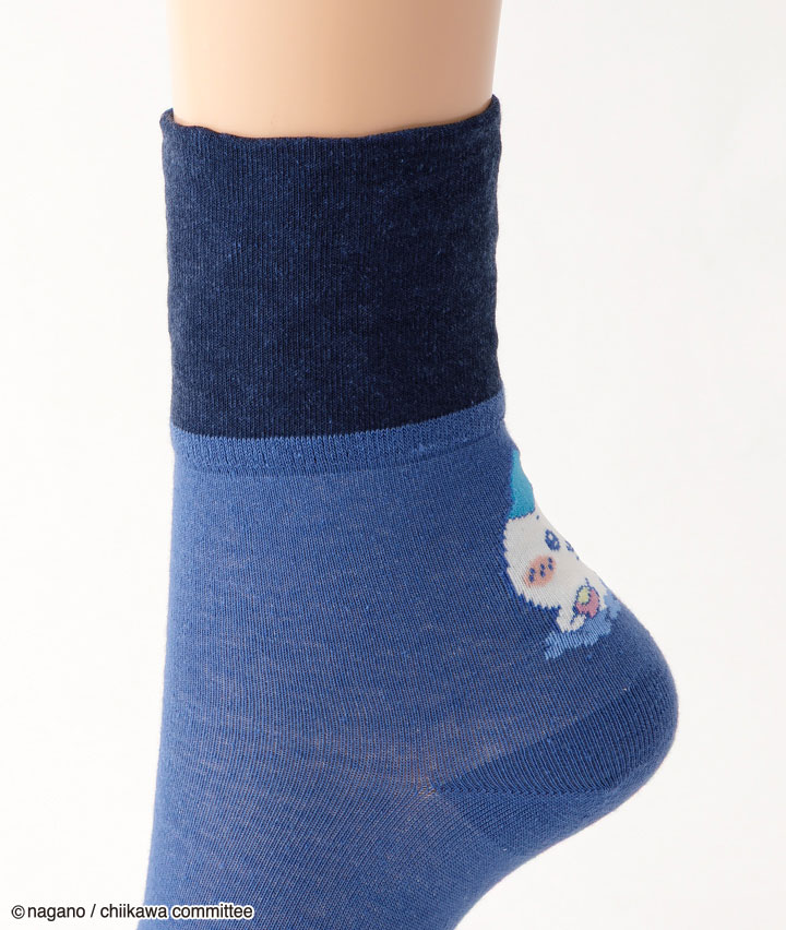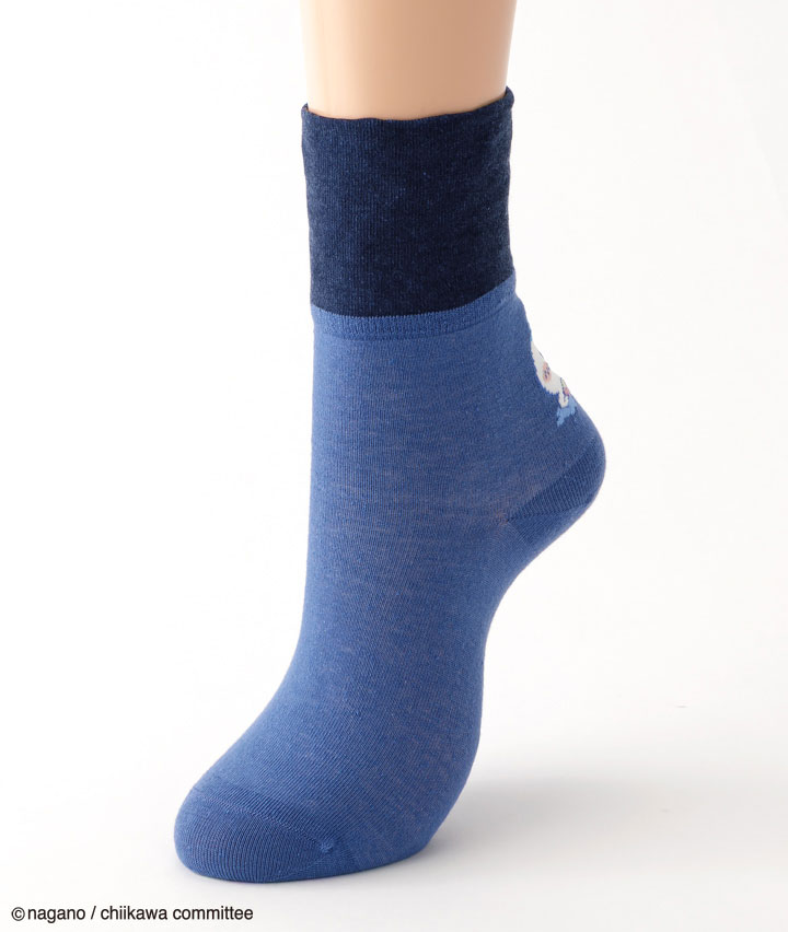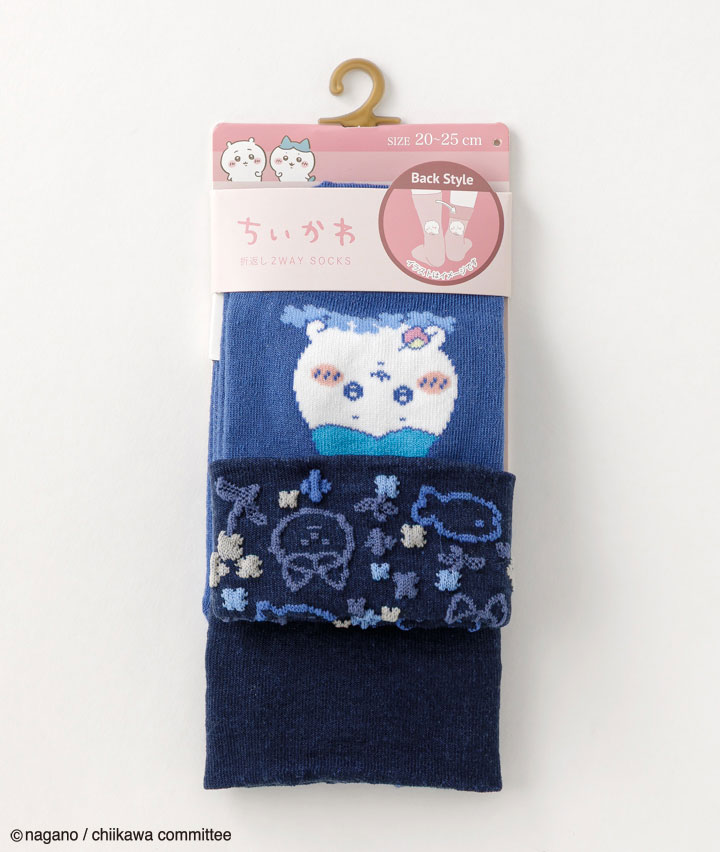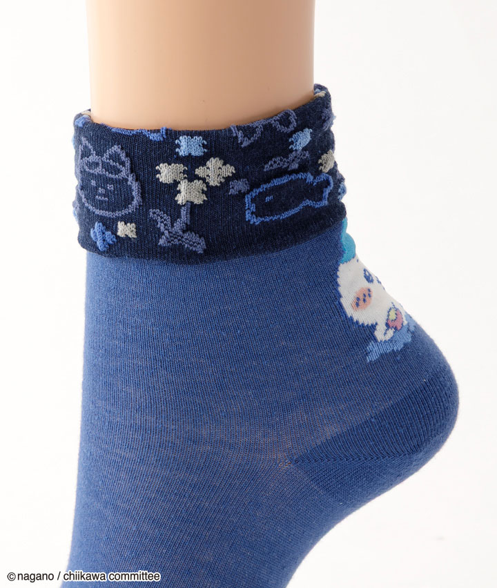 ・イラストレーター・ナガノ氏が描く X( 旧 Twitter) 発の漫画「ちいかわ」の婦人ソックスです。伸ばすと無地、折り返すと柄入りデザインの2wayクルーソックス。バックスタイルがかわいい!